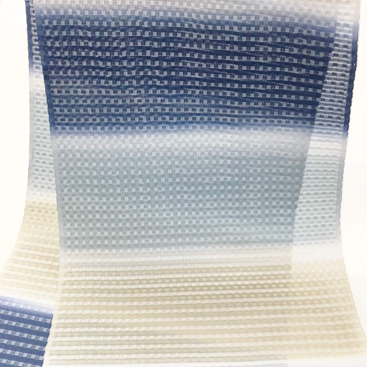 格子状に織られた絽の防染糸が、湊鼠色と留紺色と薄い柳茶色の横段暈し染められています。