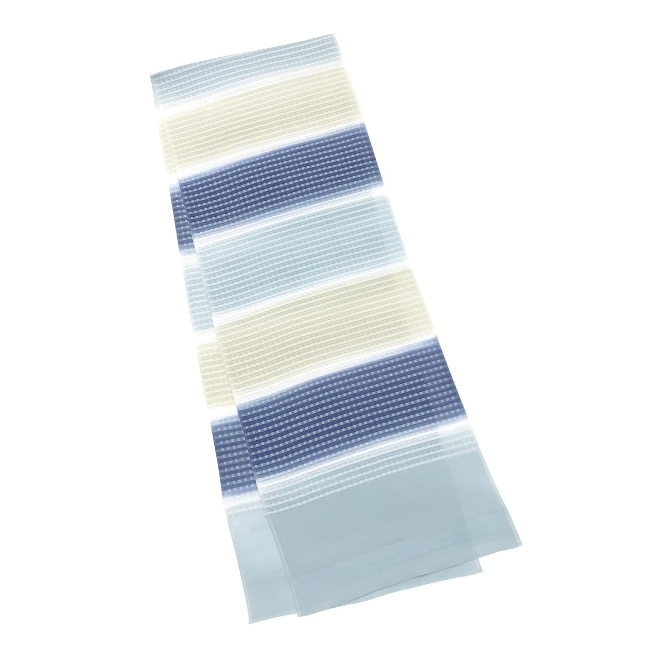 「夏帯揚げ 絽格子防染糸横段暈し 淡黄色と薄い露草色と洗柿色」