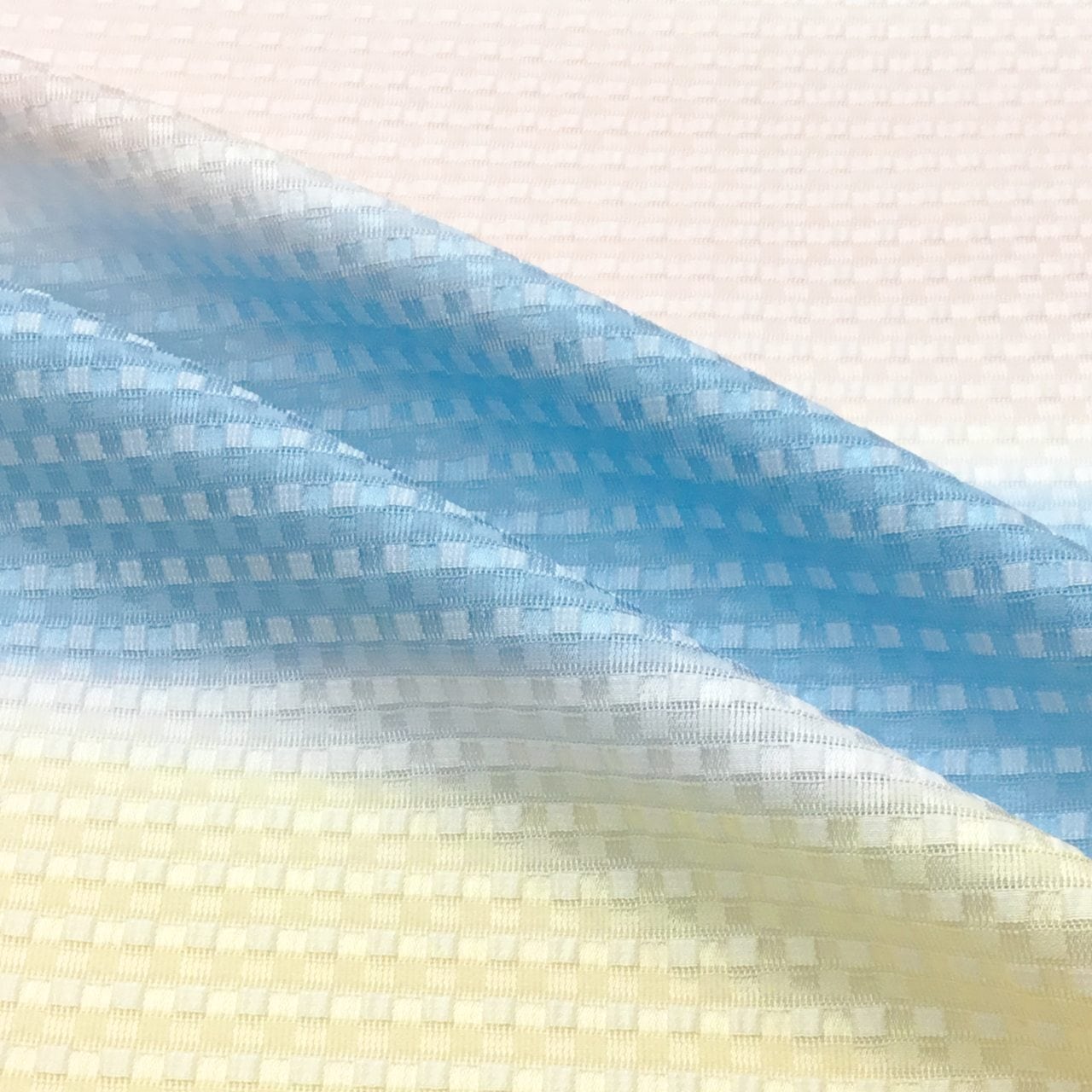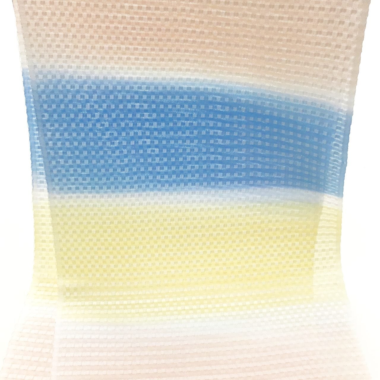 格子状に織られた絽の防染糸が、淡黄色と薄い露草色と洗柿色の横段暈し染められています。
