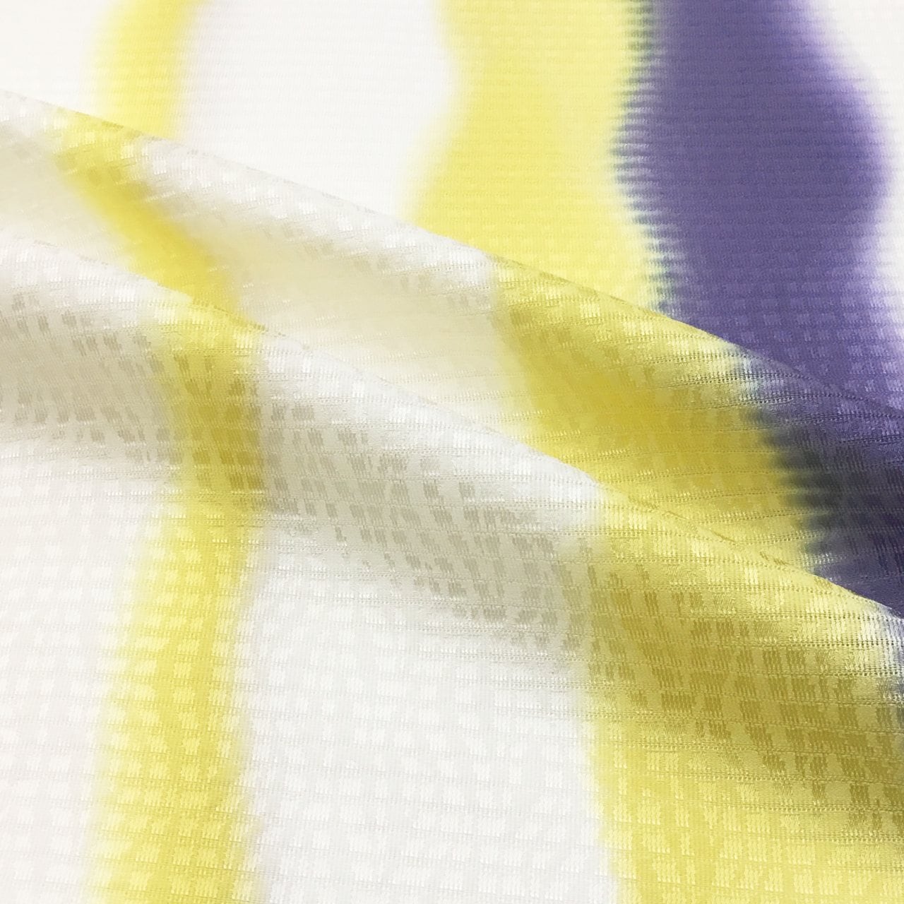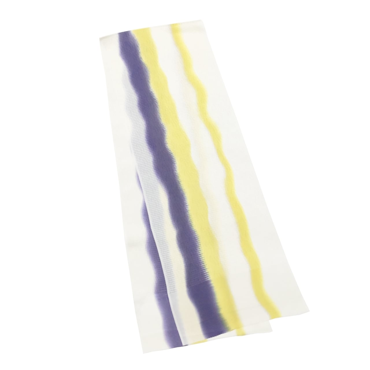 鳥の子色の絽地に経よろけの地紋が織り出され、さらにその上に2本の黄色と1本の濃鼠色の経よろけが美しく染められています。涼しげで軽やかな絽の帯揚げは夏のお洒落を引き立ててくれますね。