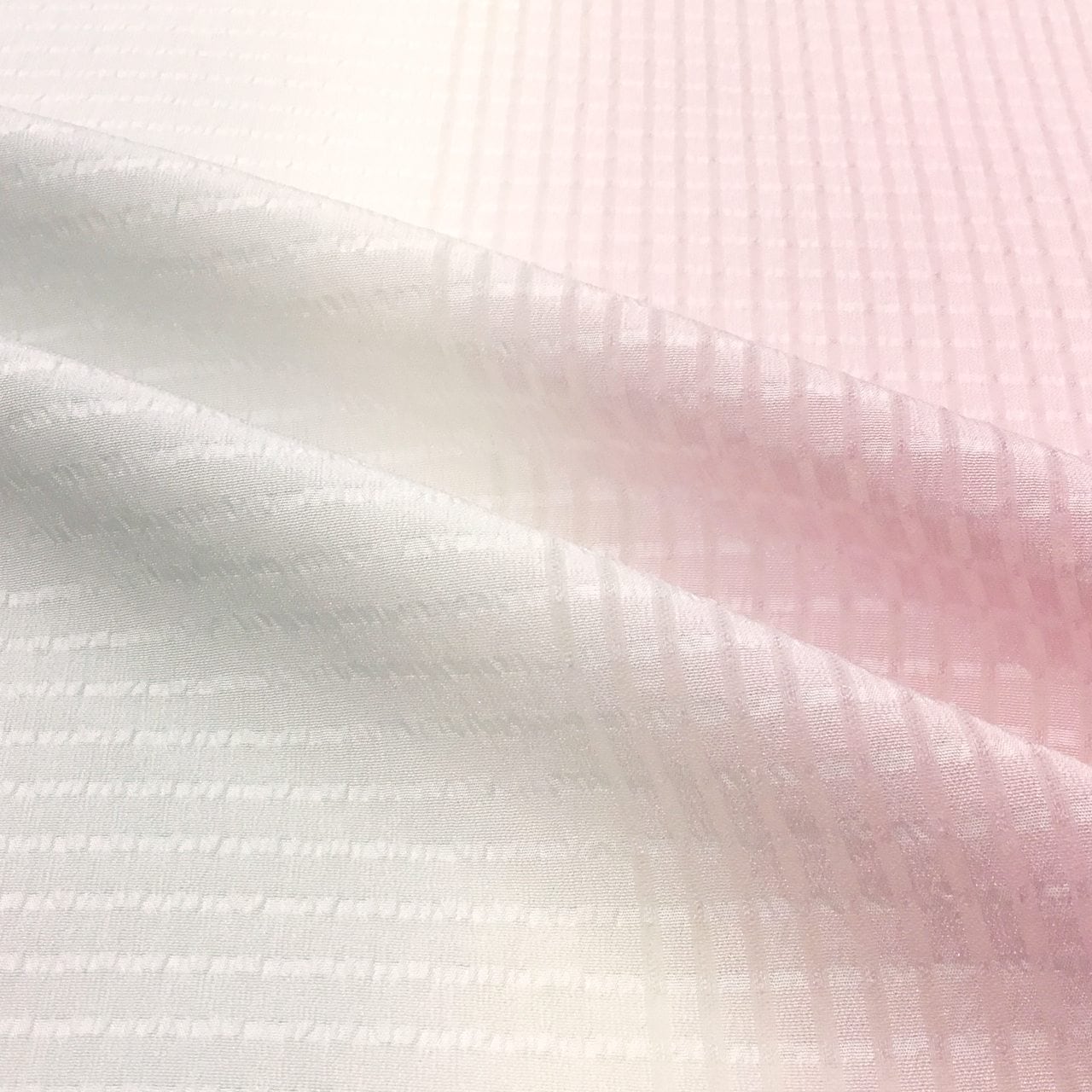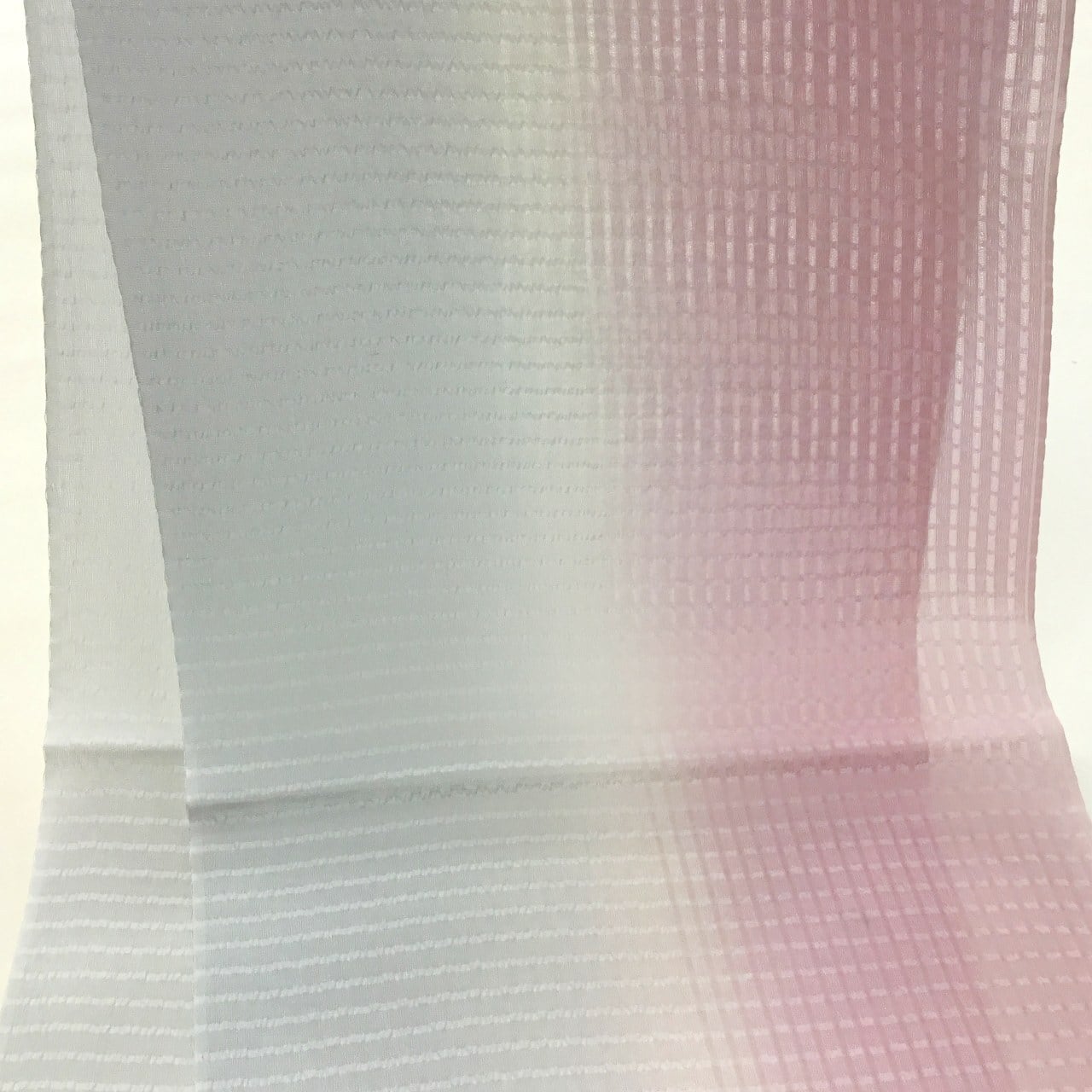 鴇色の部分のみ経絽で織られ、鴇色と白鼠色が美しい縦暈しで染め分けられています。