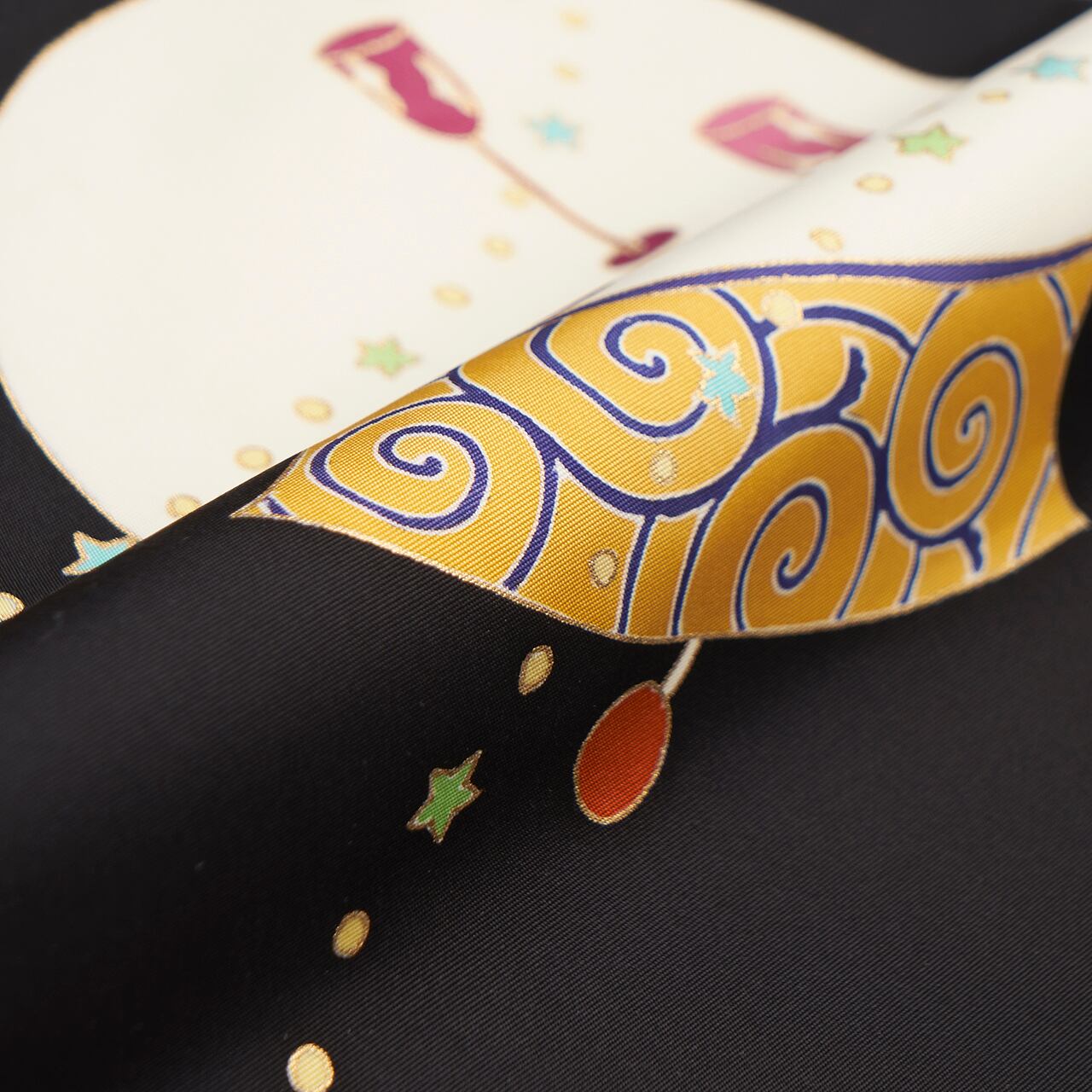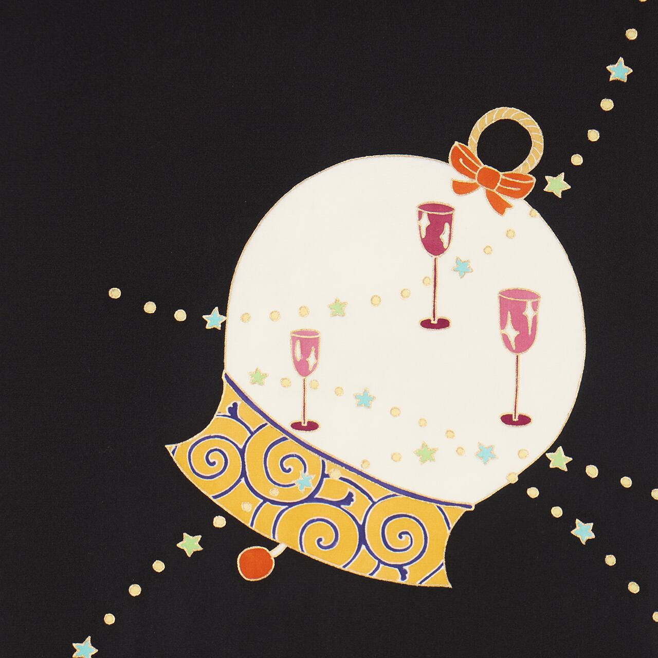 ふっくらとした形のベルに星が散りばめられ、キラキラとしたシャンパングラスが並べられた、クリスマスシーズンに締めたくなるような素敵な友禅の九寸名古屋帯です。