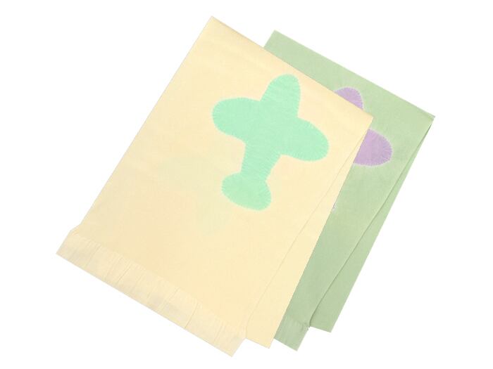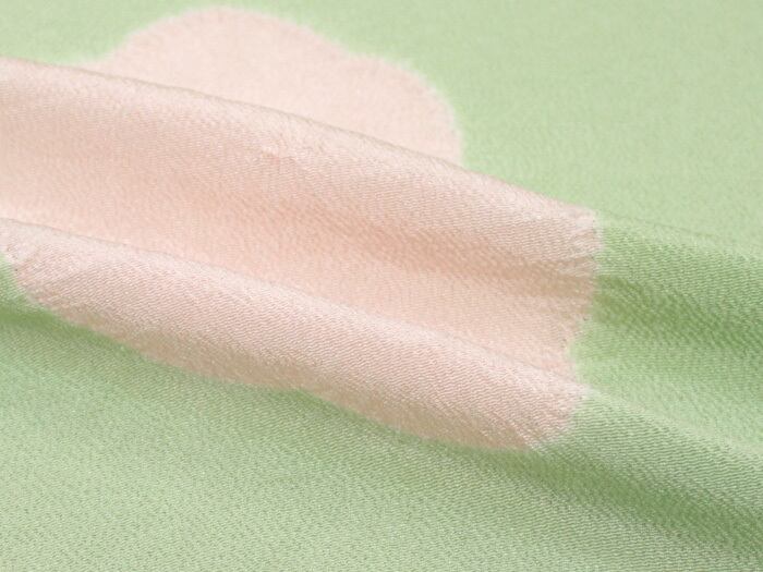 若緑色地に淡いピンクと藤色の絞り染めで、飛行機と雲の模様が染められた縮緬の帯揚げです。