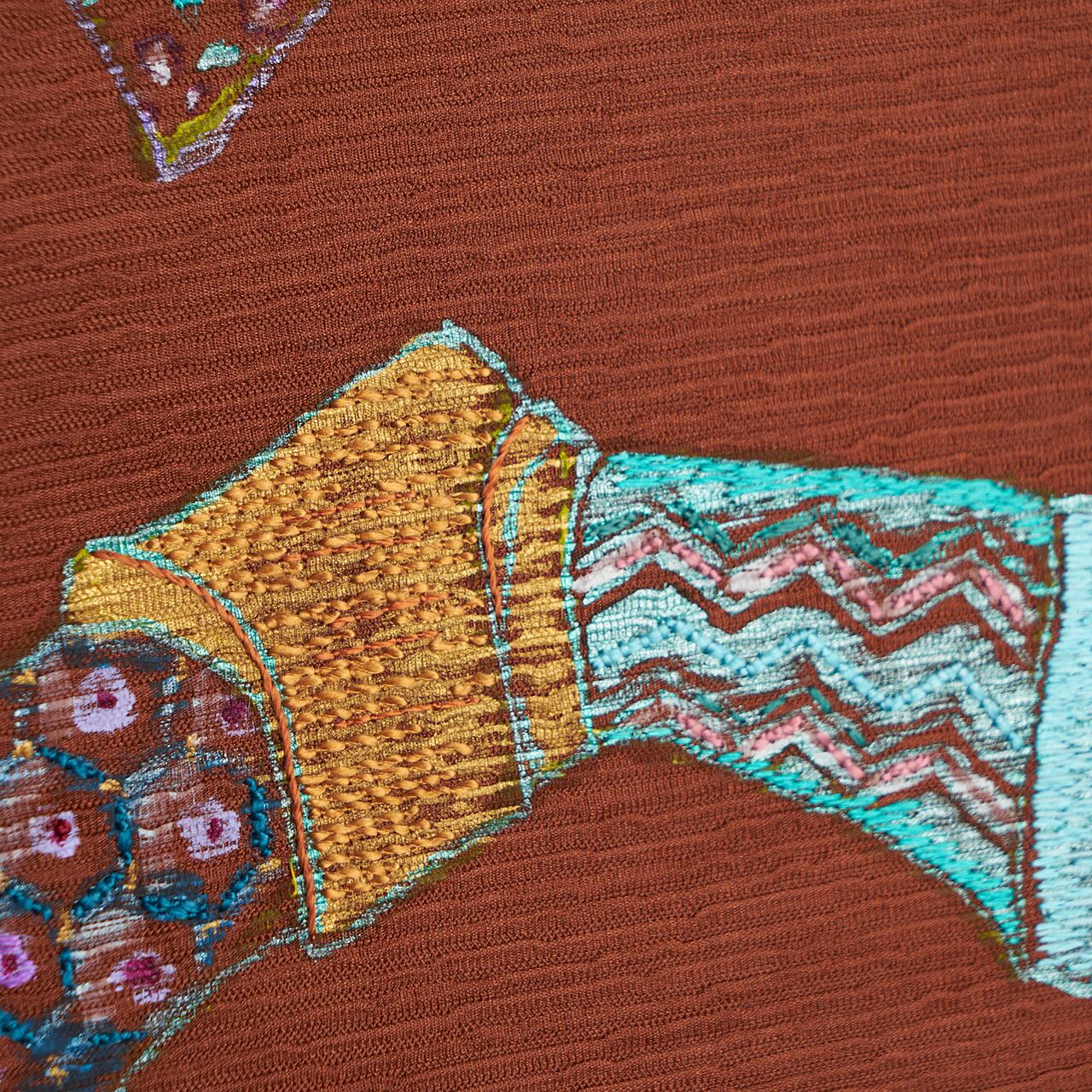 光沢のあるメタリックな顔料も使われていて、その光沢と刺繍糸の光沢が入り混ざって不思議な質感となっています。