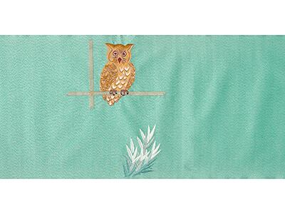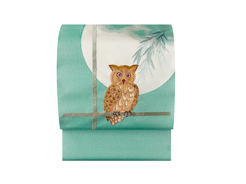 翡翠のような青味のある緑・青磁色の地金通しの生地に、大きな白い月を背景にまん丸な目を開いたミミズクが刺繍で描かれた名古屋帯です。