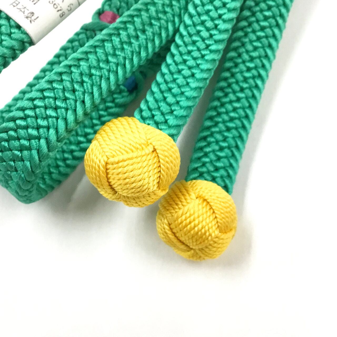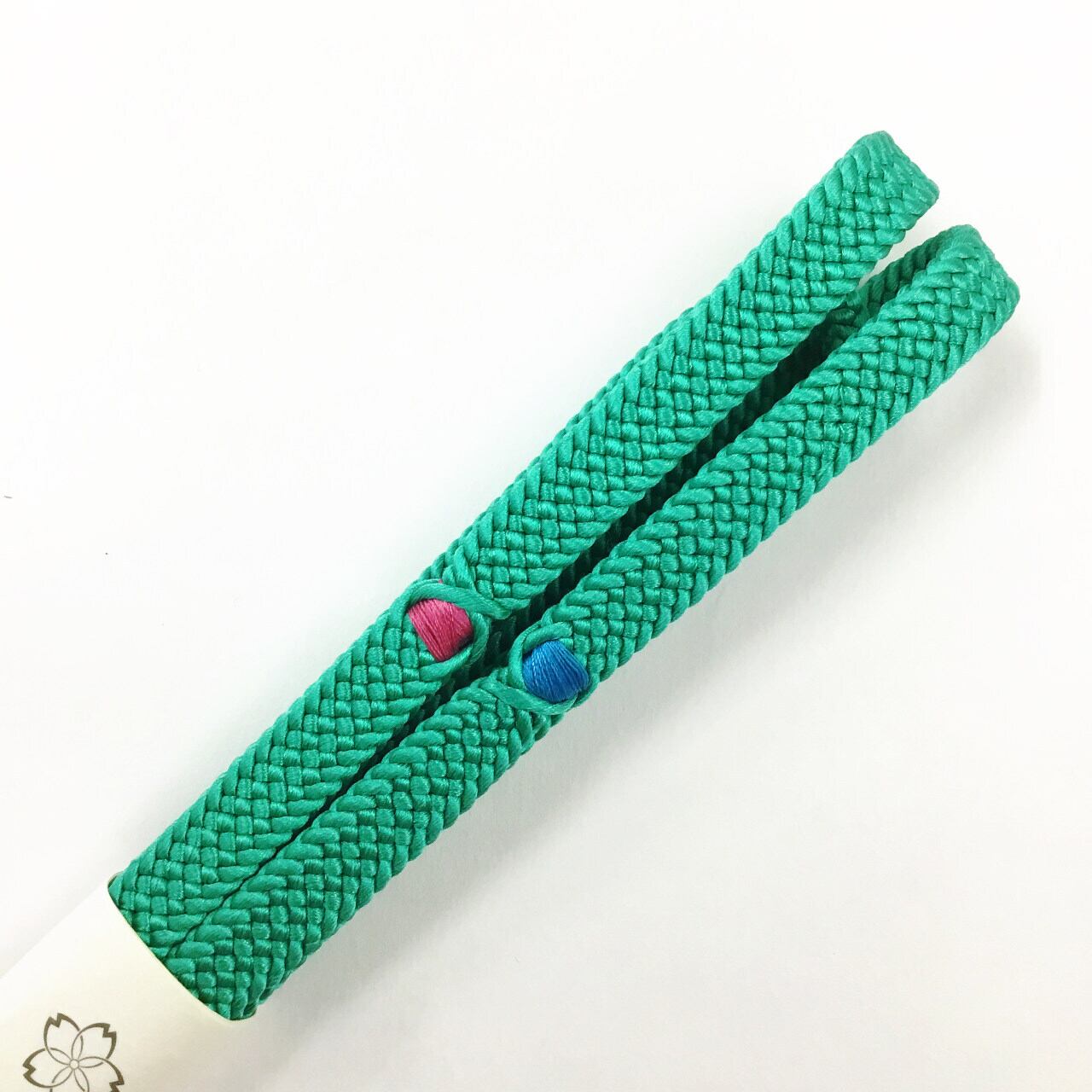 色味は全体が花緑青色で組まれており、アクセントとして途中に0.5cmほどの巾で中紅色と花浅葱色の糸がぽちっと巻かれています。