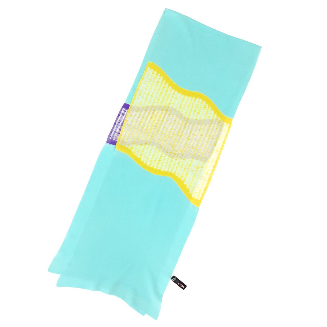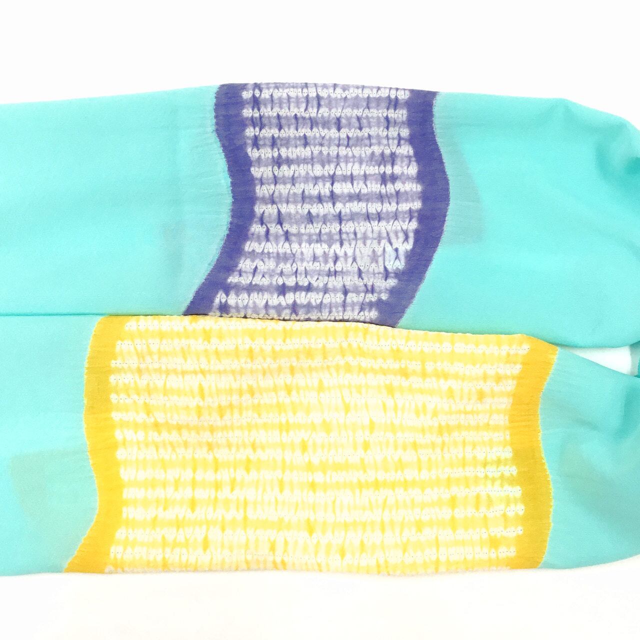明るい新橋色地の生地に大きさの違う中黄色と紅掛花色の波打つ模様が、着こなしのワンポイントになりそうなお洒落な一点です。