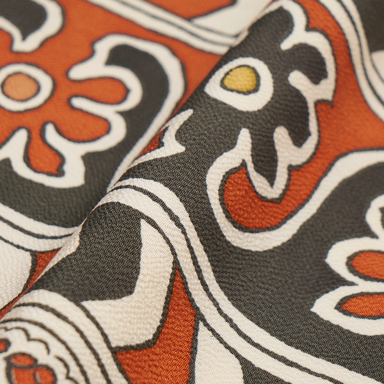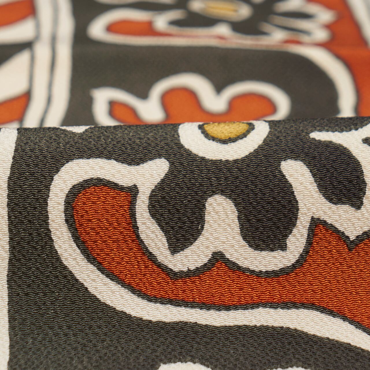 象牙色に墨色で輪郭を取った中に紅樺色という、主に3色の色使いですので、お着物合わせはしていただきやすいと思います。