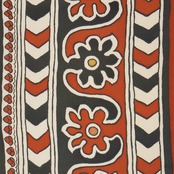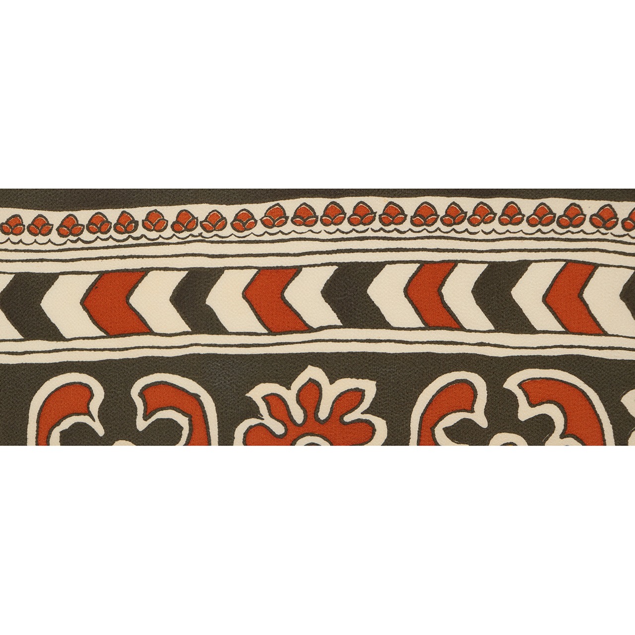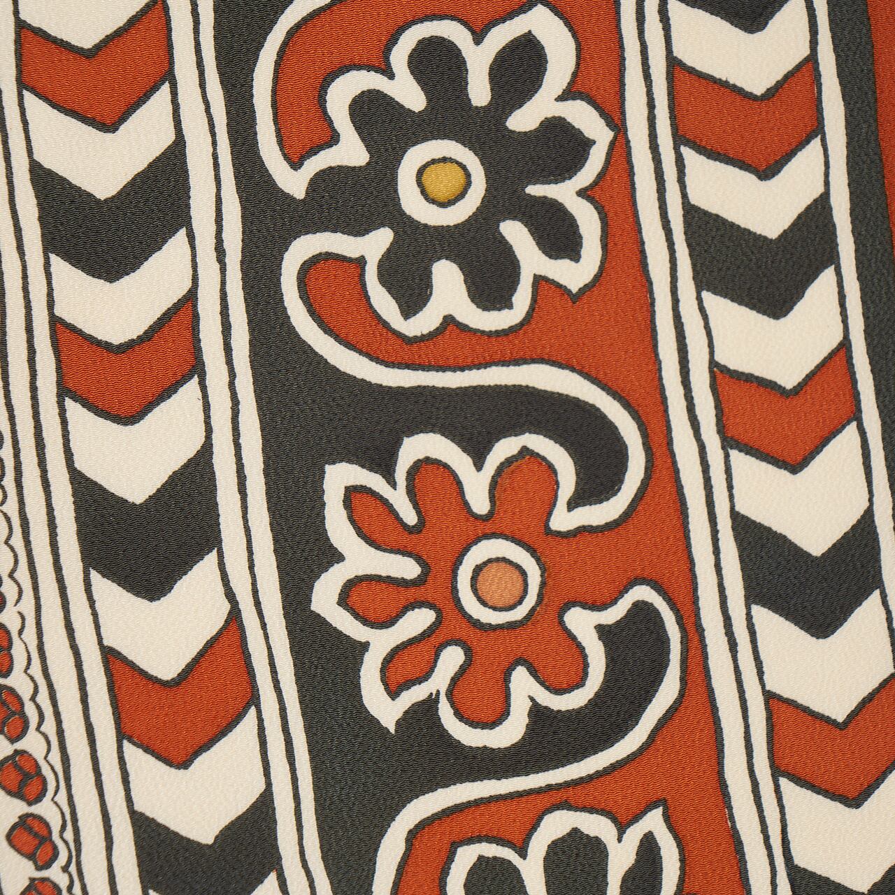 少しシボのある象牙色のちりめん地に、大胆にボーダーが引かれ、中心には花唐草、その両側には矢絣のような幾何学模様、左端には小さなお花のスカラップと、盛りだくさんの模様が手描きのロウケツ染で染められた可愛い九寸名古屋帯です。