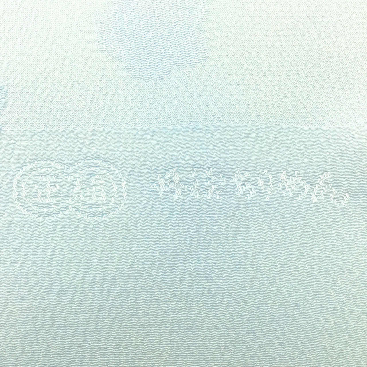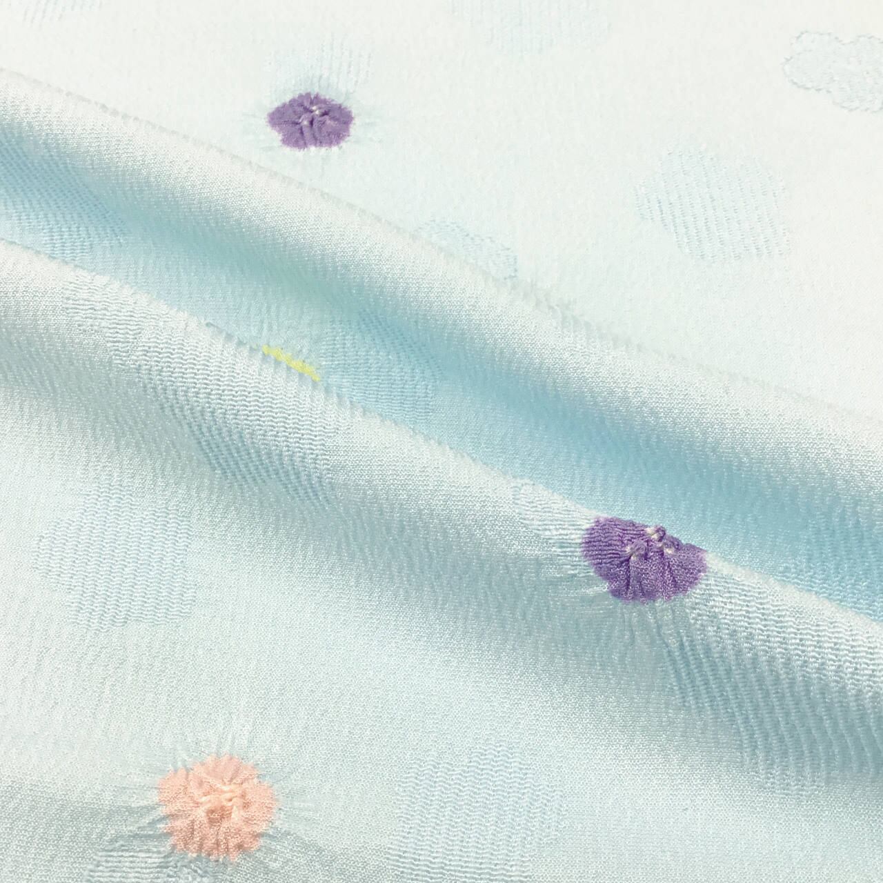 水色の少し光沢のあるしっかりとした縮緬に、2.5~3cmの2種類の小花模様が地模様で織り出されています。