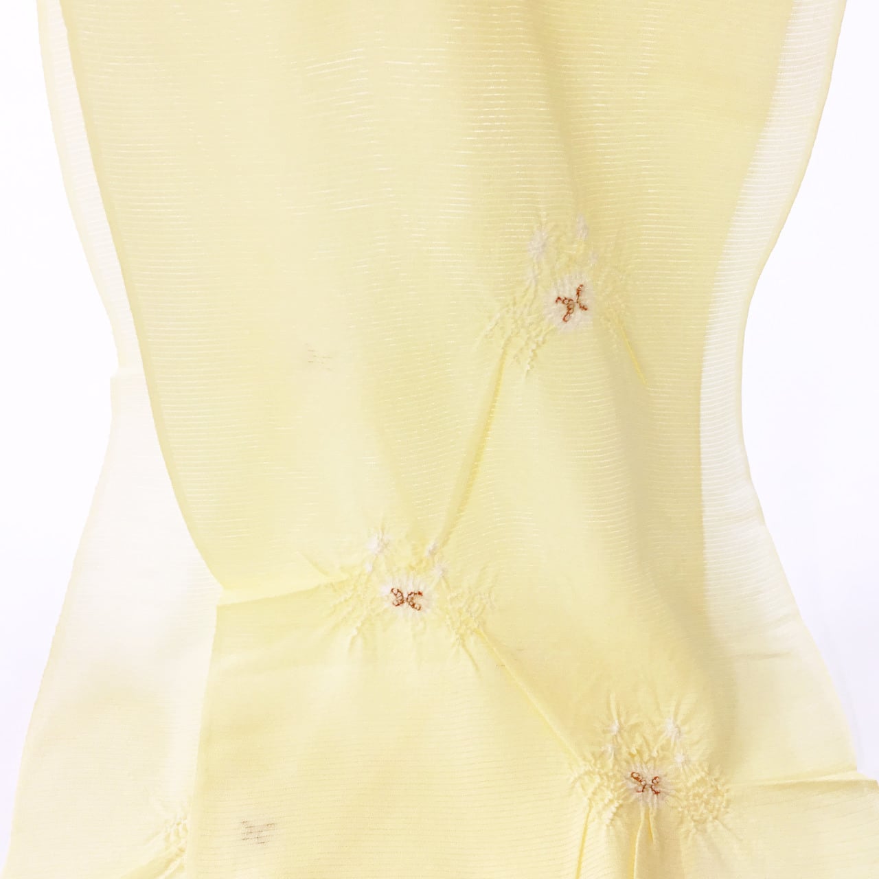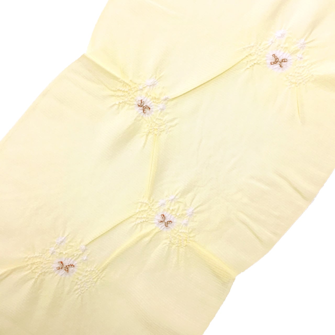 薄い淡黄色で全体が染められているこちらの帯揚げは、カニの体の部分を絞って白色で表し、内側の模様の部分のみ唐茶色でアクセントがつけられています。