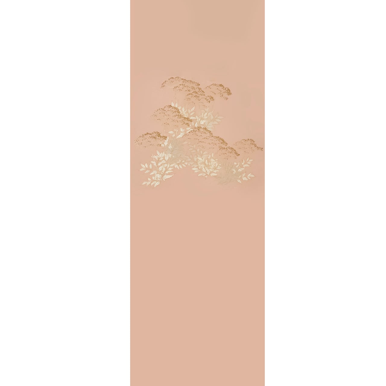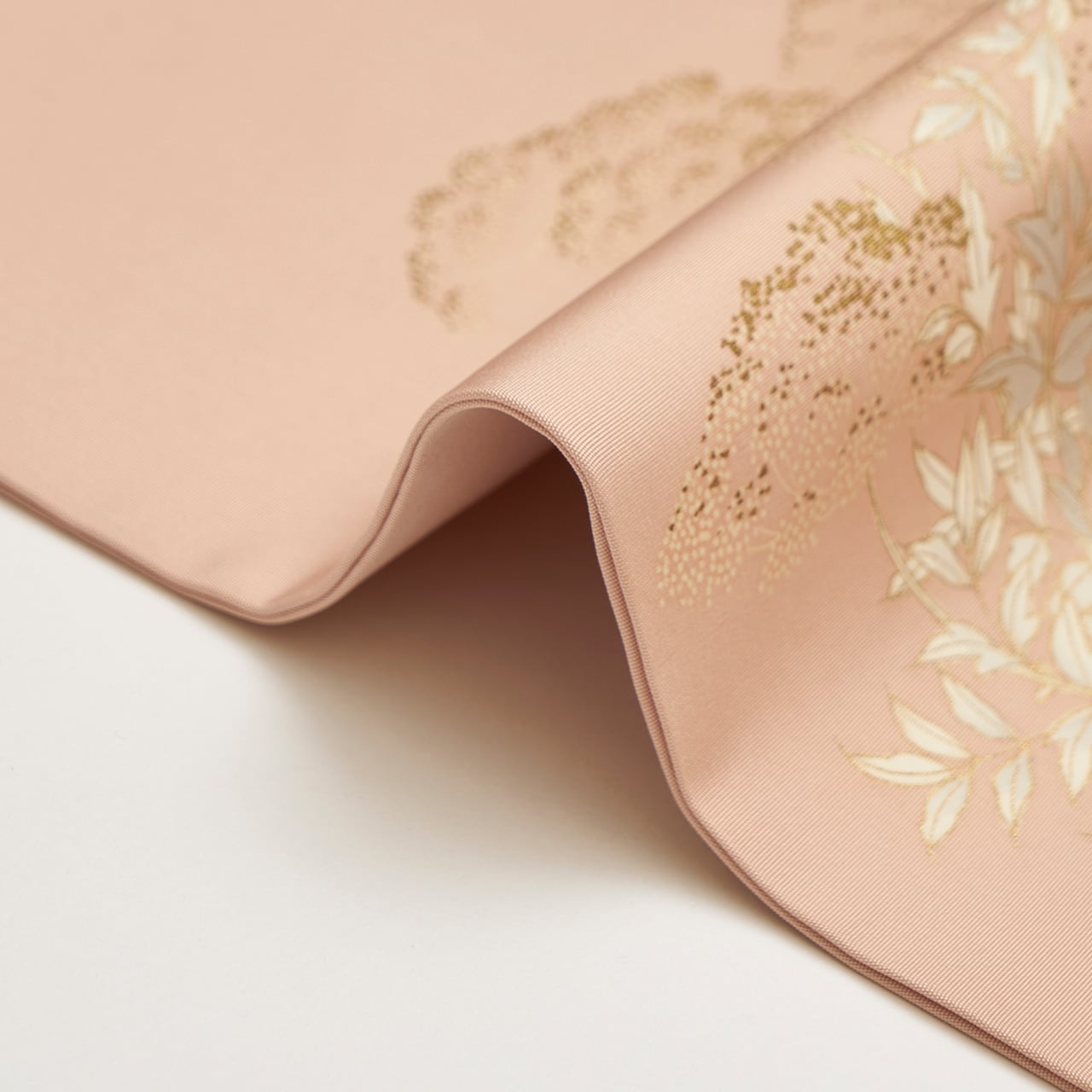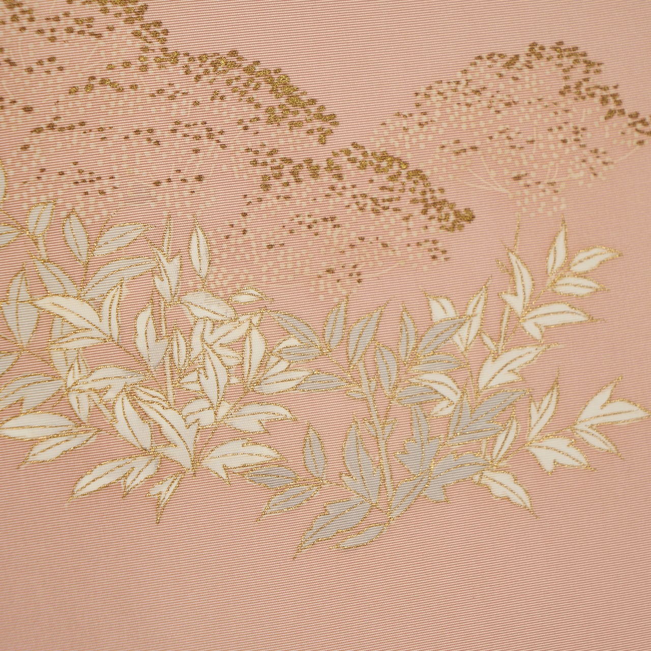 淡いベージュ味のあるピンク・灰梅色のしっかりとした塩瀬の生地に、白揚げの友禅のように女郎花の葉が染め抜かれ、それに少し淡いブルーグレー・水浅葱色が挿され、お花は少し燻したような金で描かれた、秋をテーマにしたとても上品な雰囲気の九寸名古屋帯です。