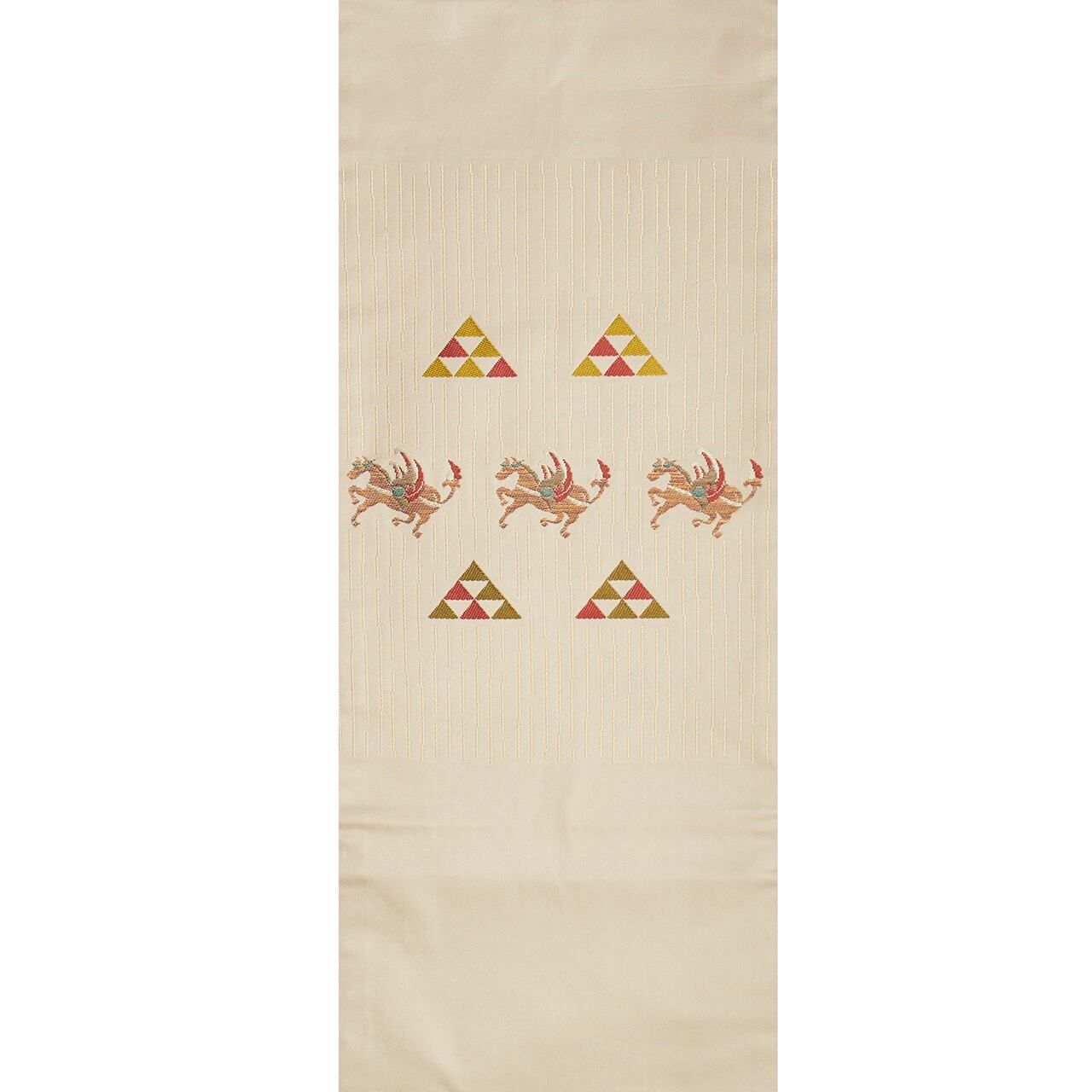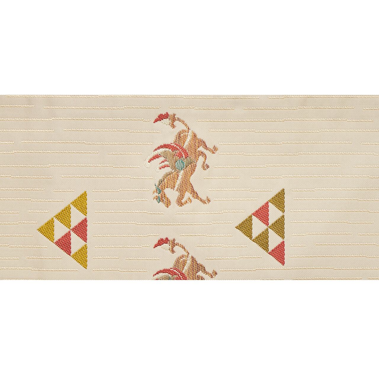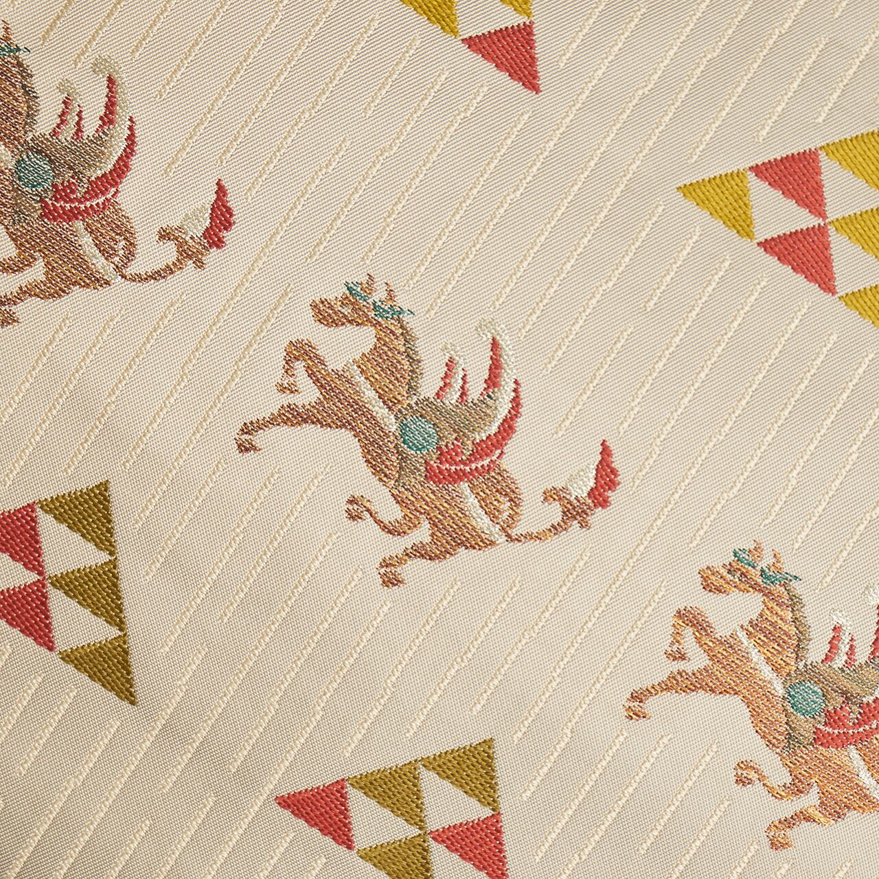 少しグレー味のあるベージュ・灰白色の生地のお太鼓の部分に縦縞が織られ、そこに蘇芳色や青朽葉色、鶯色に彩られた鱗文が置かれ、その間を羽のはえた馬・ペガサスが駆けている様子が織り出された、ユニークな模様の九寸名古屋帯です。