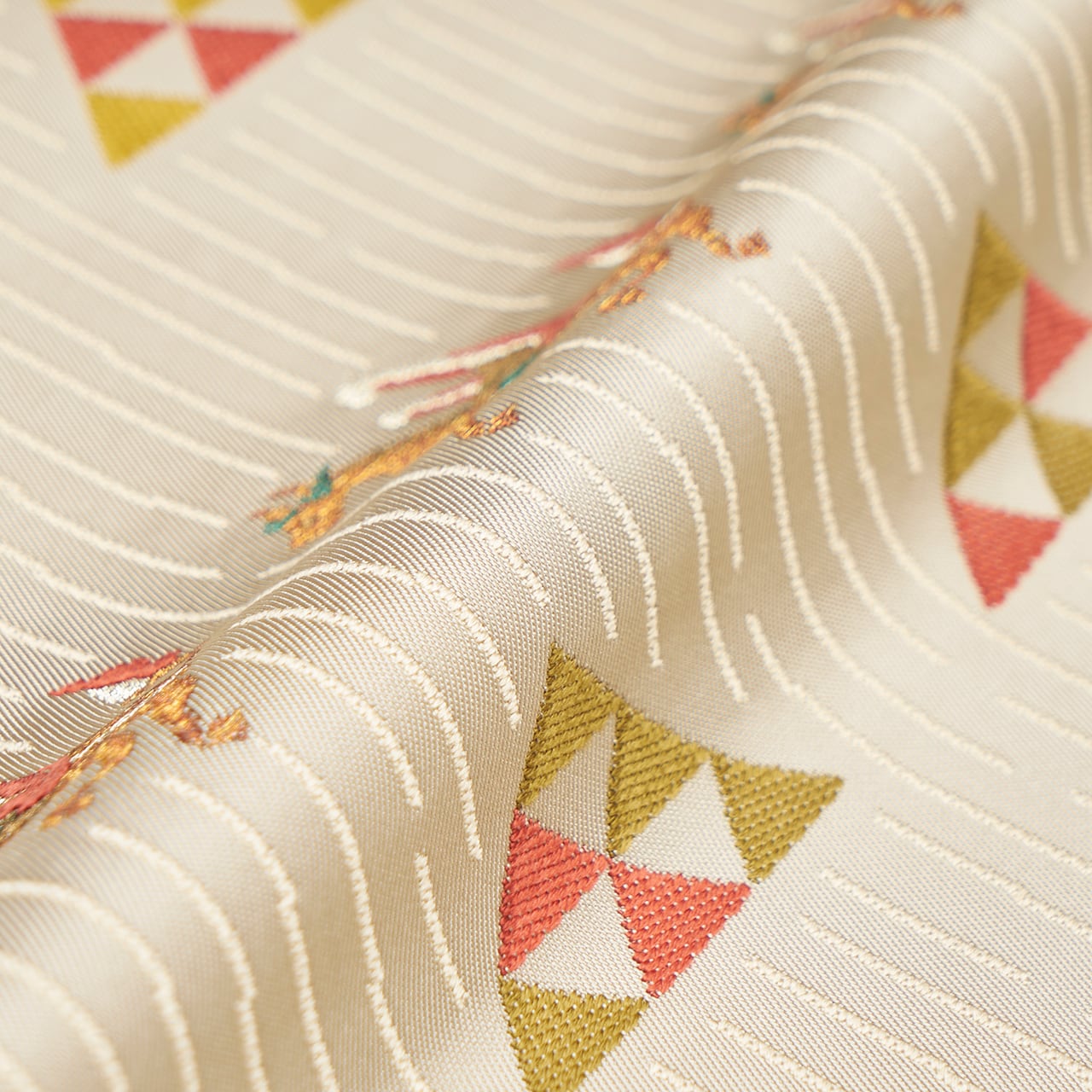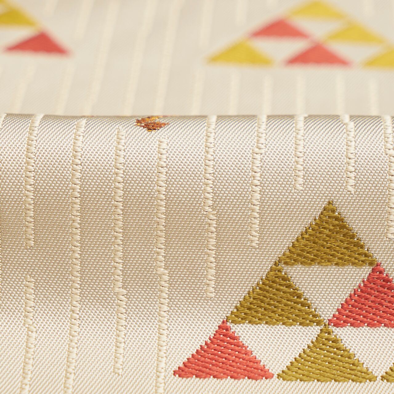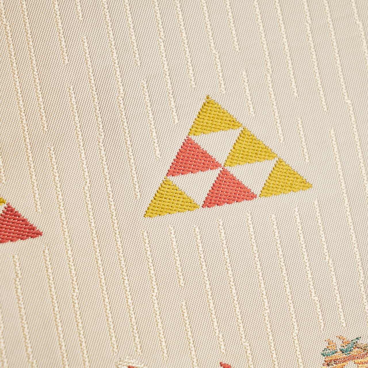 少しグレー味のあるベージュ・灰白色の生地のお太鼓の部分に縦縞が織られ、そこに蘇芳色や青朽葉色、鶯色に彩られた鱗文が置かれ、その間を羽のはえた馬・ペガサスが駆けている様子が織り出された、ユニークな模様の九寸名古屋帯です。