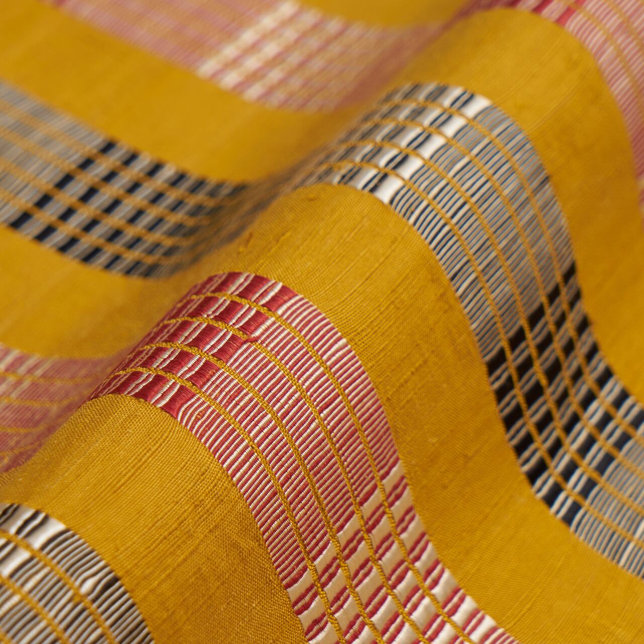 道頓織(ロートン織)は経糸を浮かせて模様を織り出す技法ですが、こちらは大きな四角の部分が2色の経糸を交互に浮かせて織られているため、段によって浮き出ている色が変わっています。