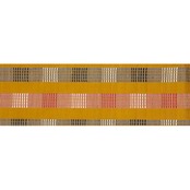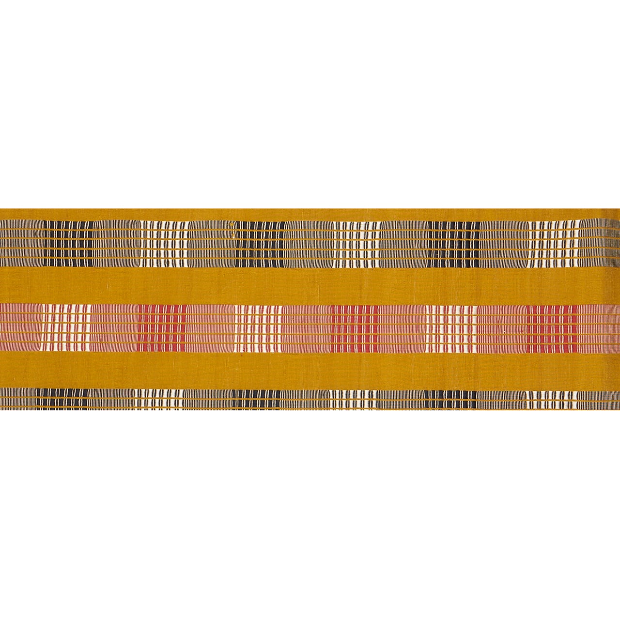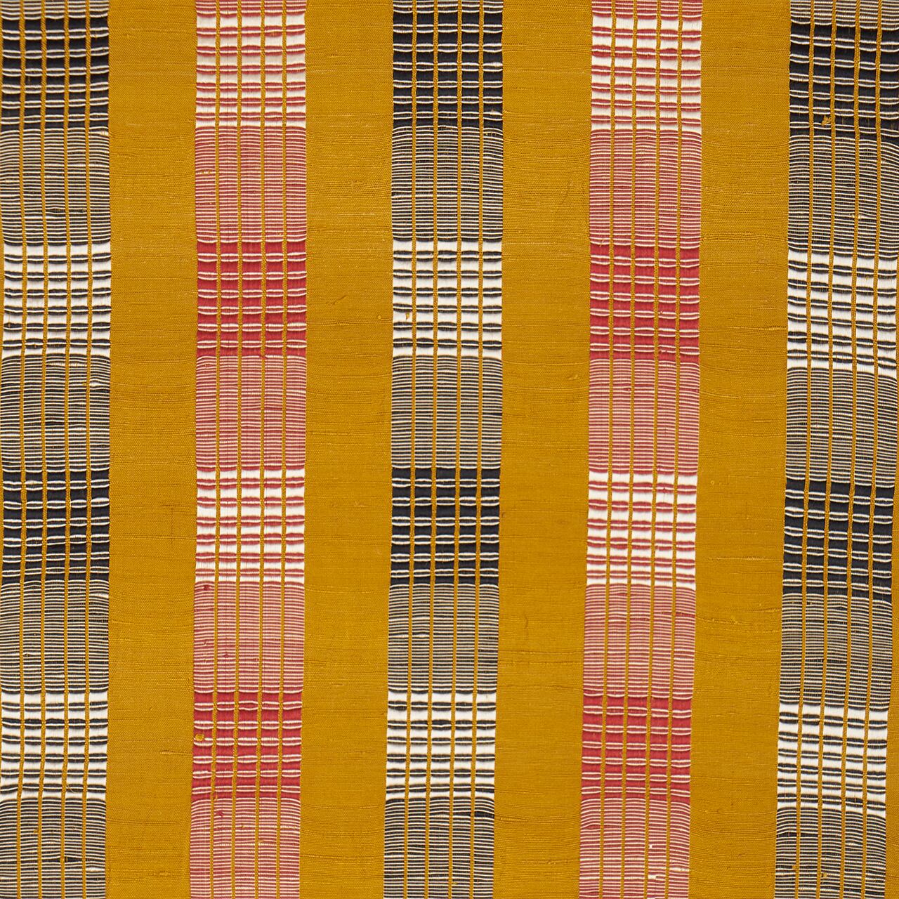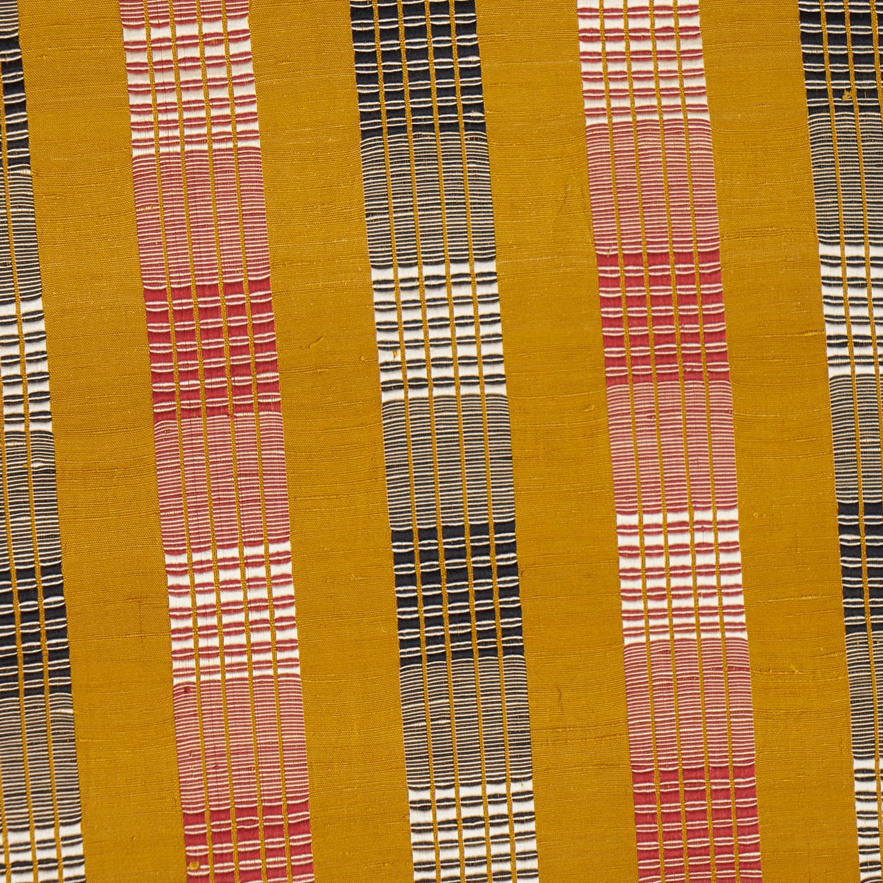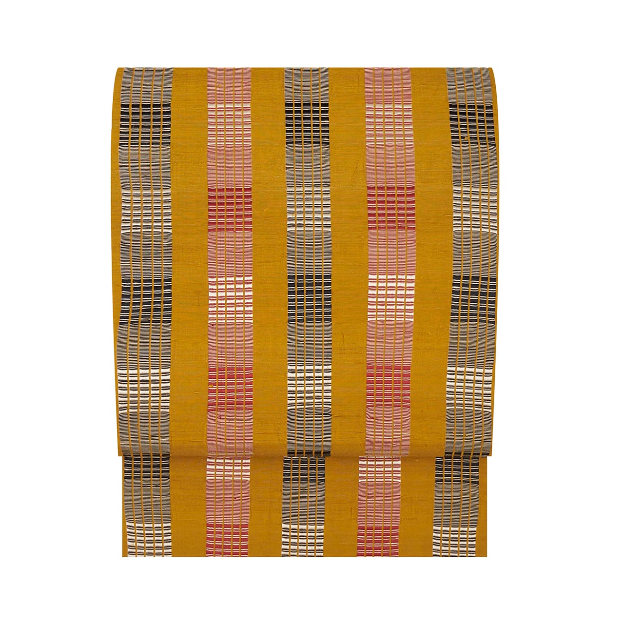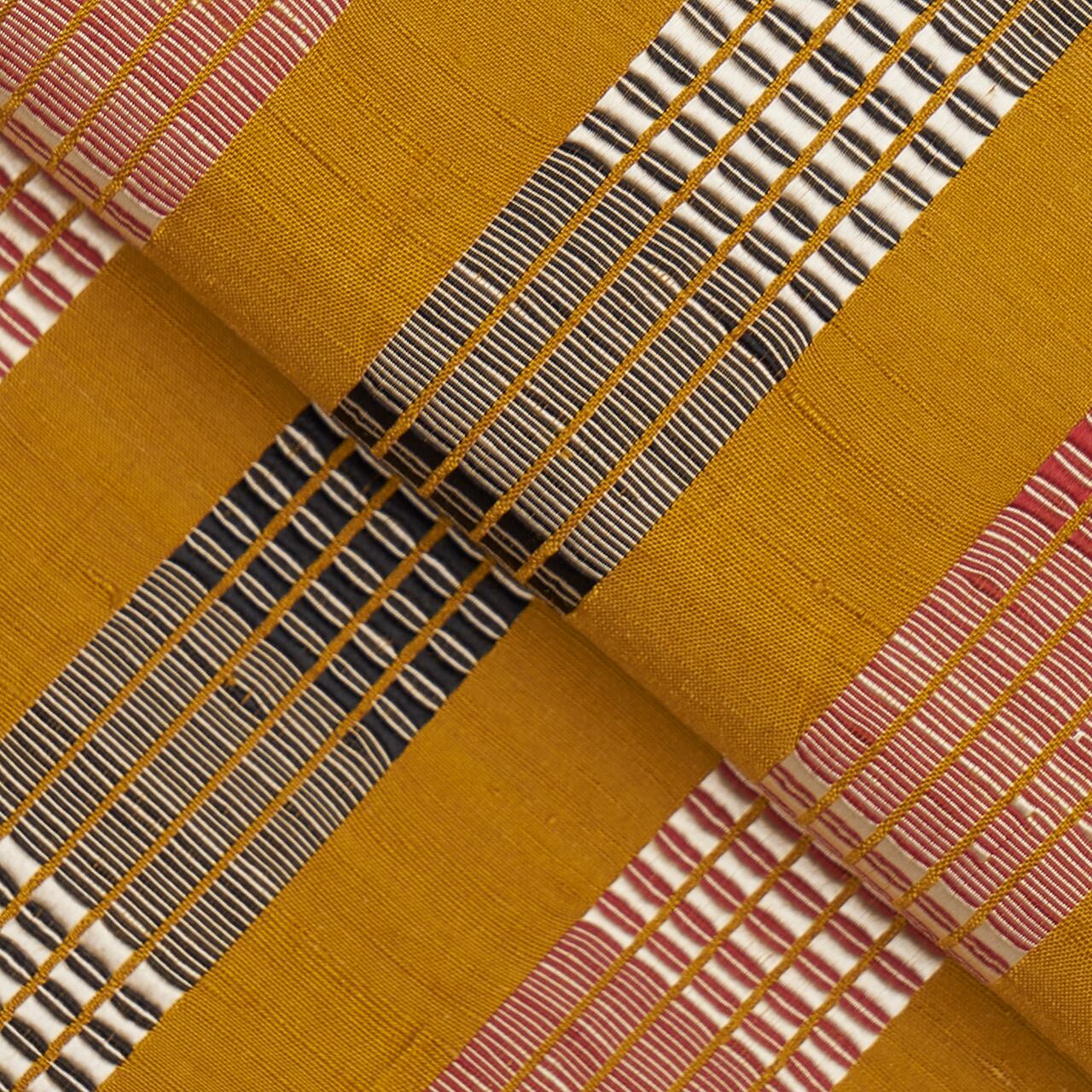 こっくりとした辛子色・山吹茶色の紬地に、ひと幅に5本の道頓織の縞が、蘇芳色と白と黒で織り出された、すっきりと格好良いイメージの九寸名古屋帯です。