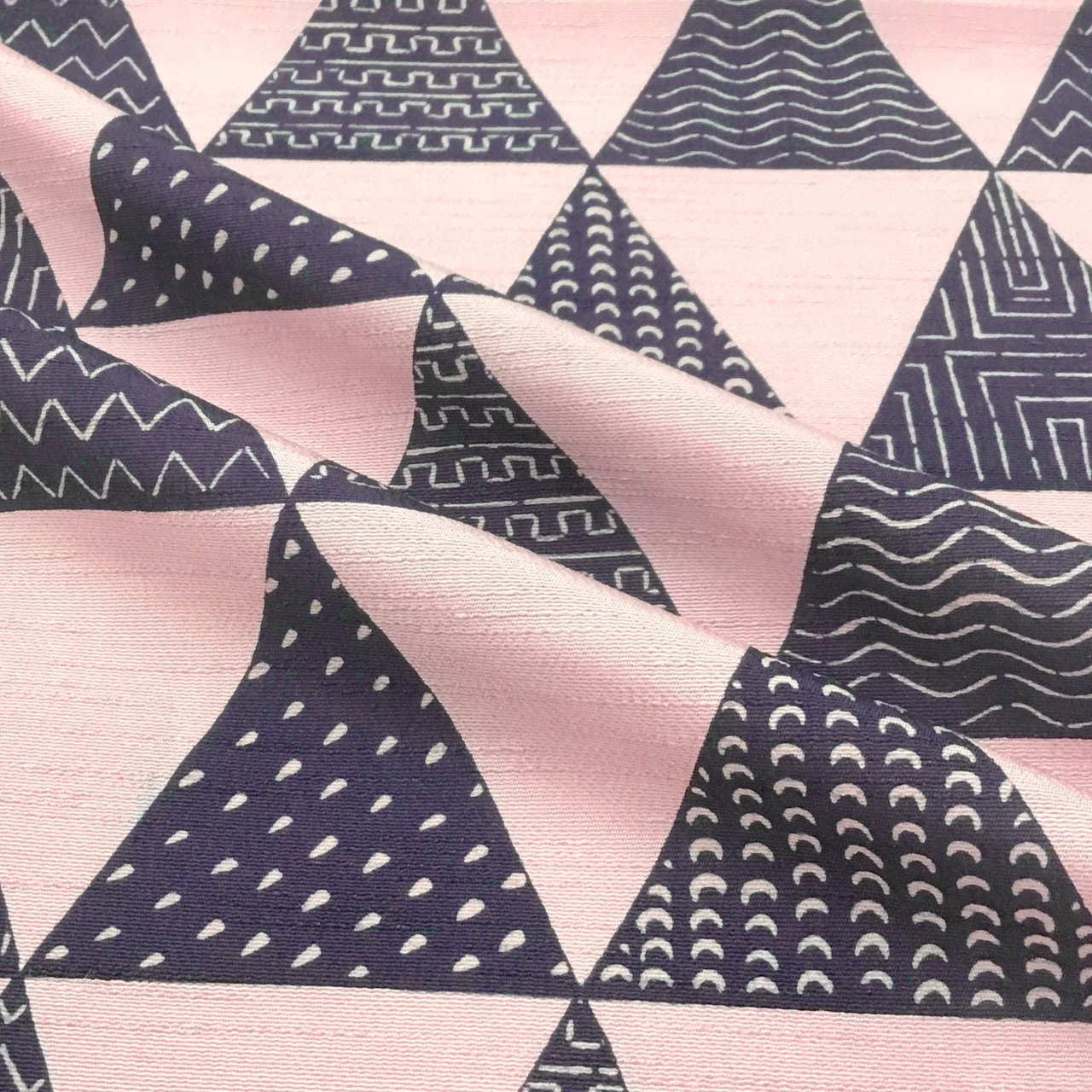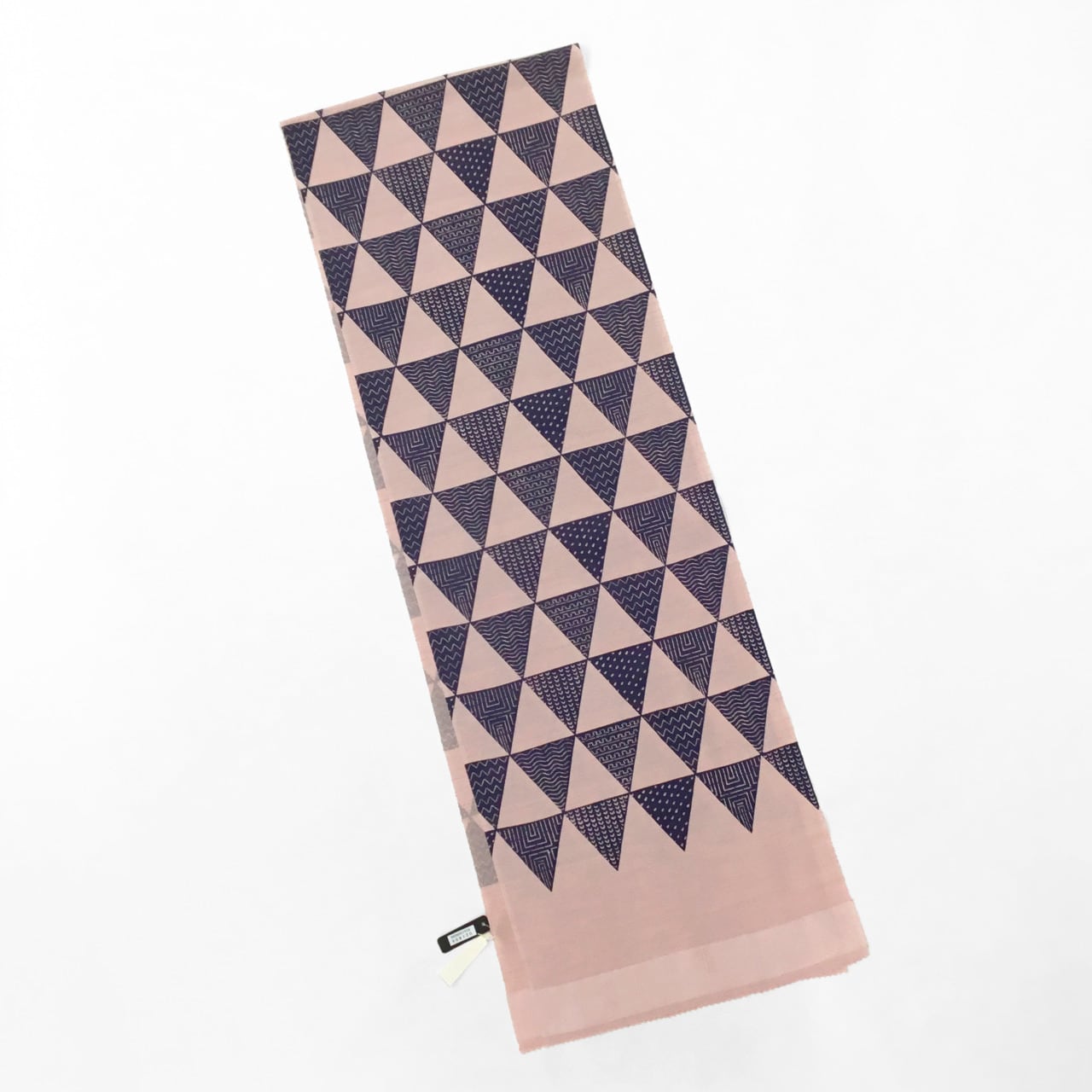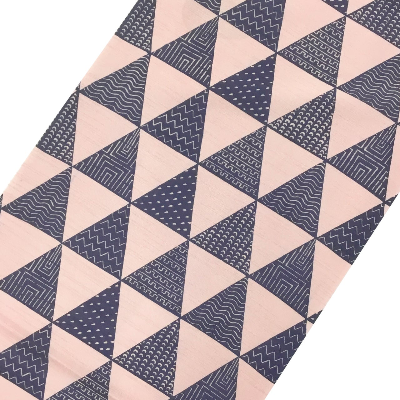 石竹色の立紬風の地に鉄紺色の鱗模様が並び、さらにその中に様々な幾何学模様が描かれているユニークな帯揚げです。