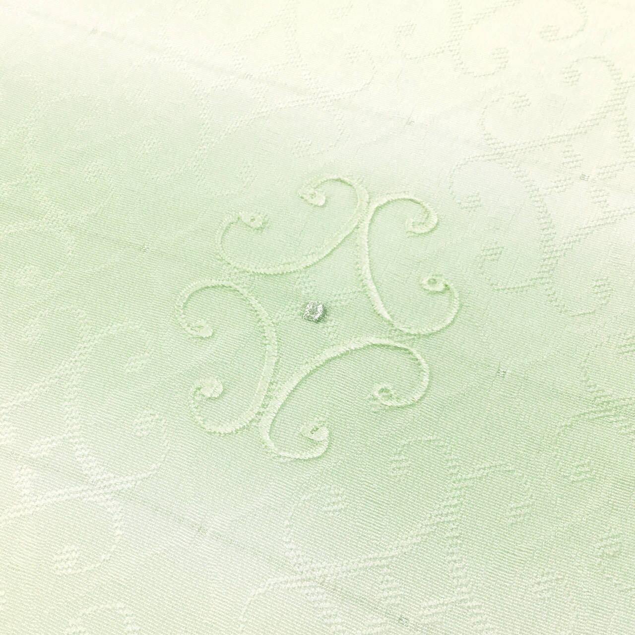 蔓文地紋の生地に薄い白緑色の段暈しが染められており、所々ある蔓文刺繍の真ん中には銀糸が使われています。