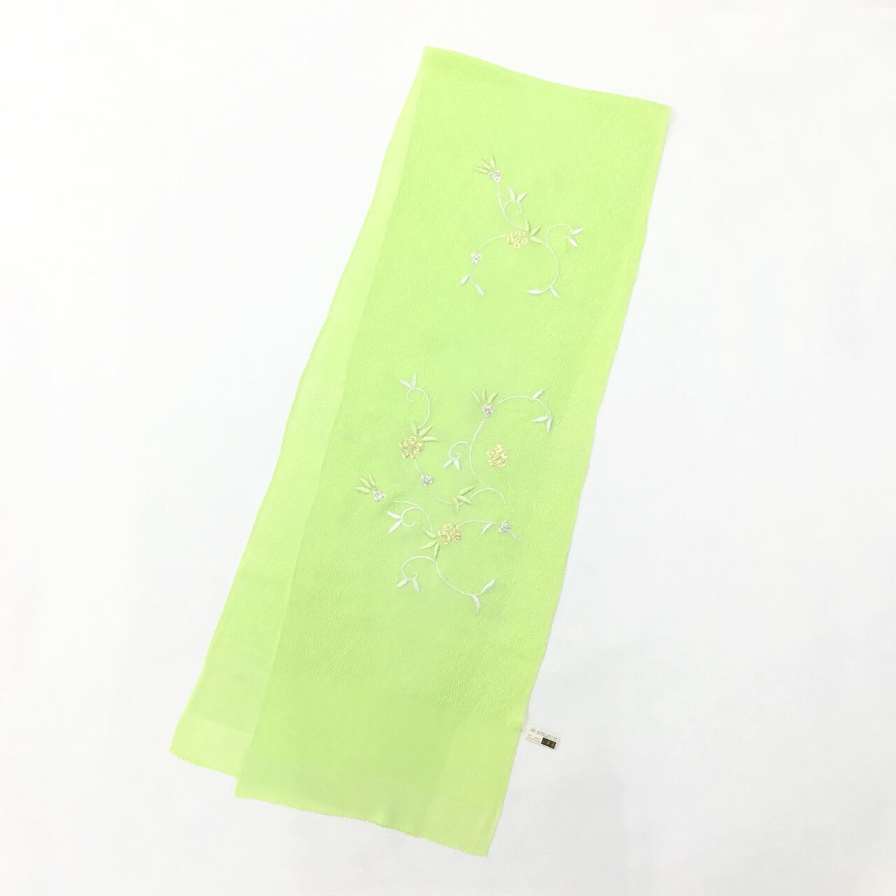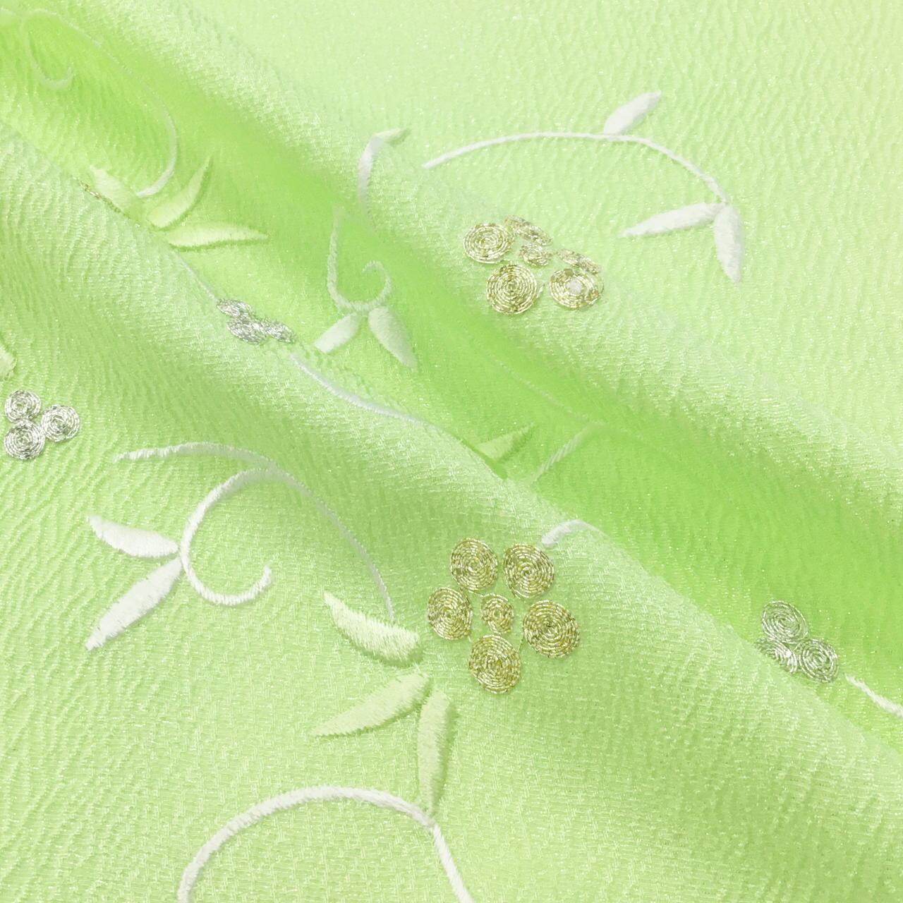 金糸が織り込まれた丹後ちりめんの若菜色の生地に、金糸と銀糸の花、白色と若菜色で唐草模様の刺繍があしらわれています。