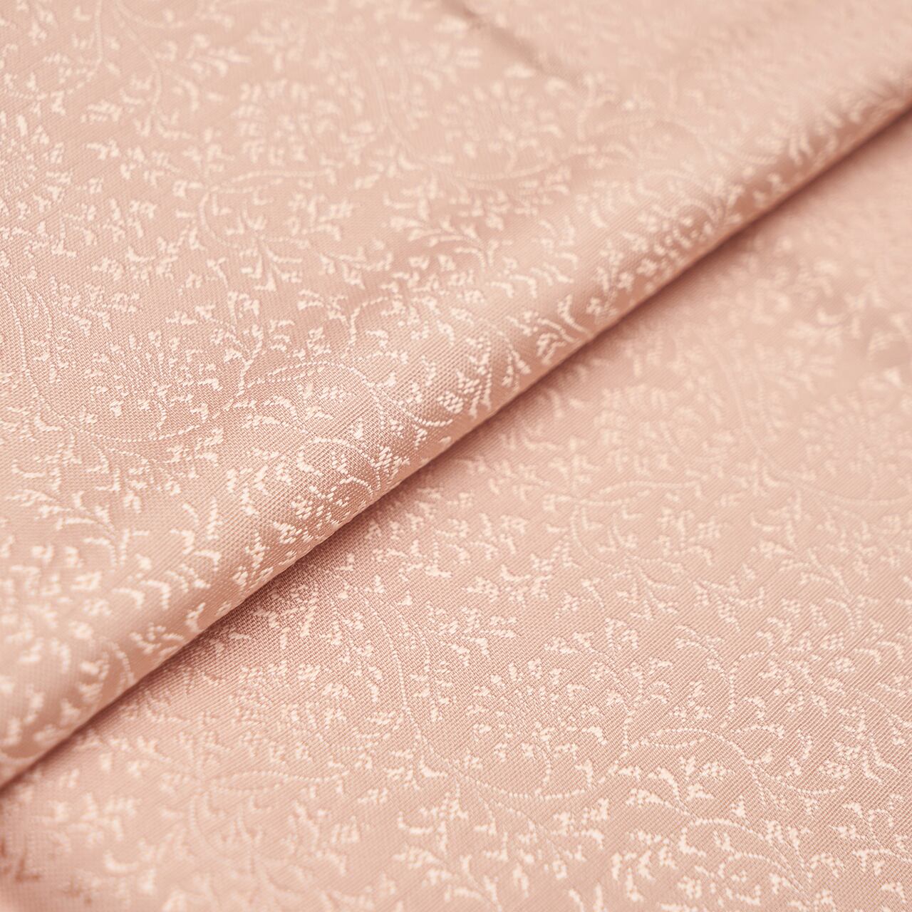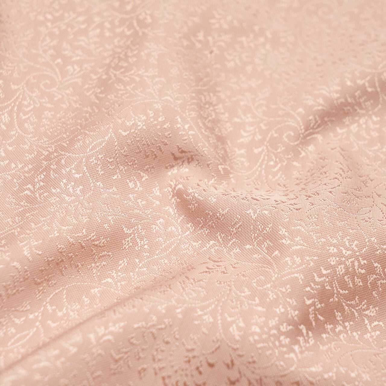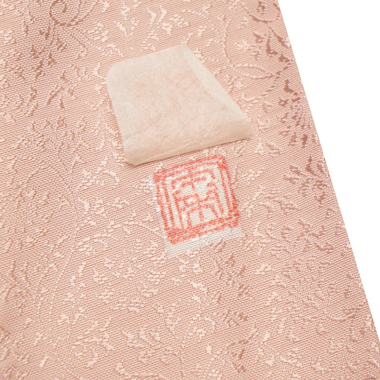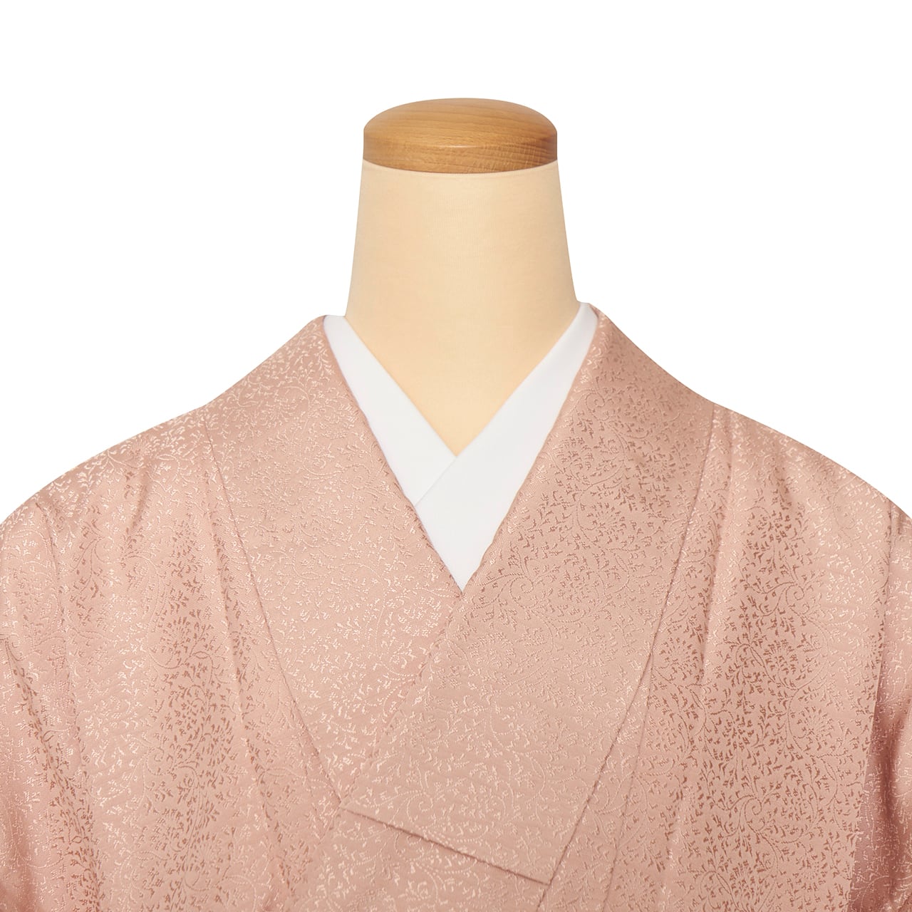 淡い桃色系のピンク・水柿色のお召織に近いようなしっかりとした打ち込みの生地に、非常に細やかな蔓に花の模様が織り出された、地紋無地のお着物です。