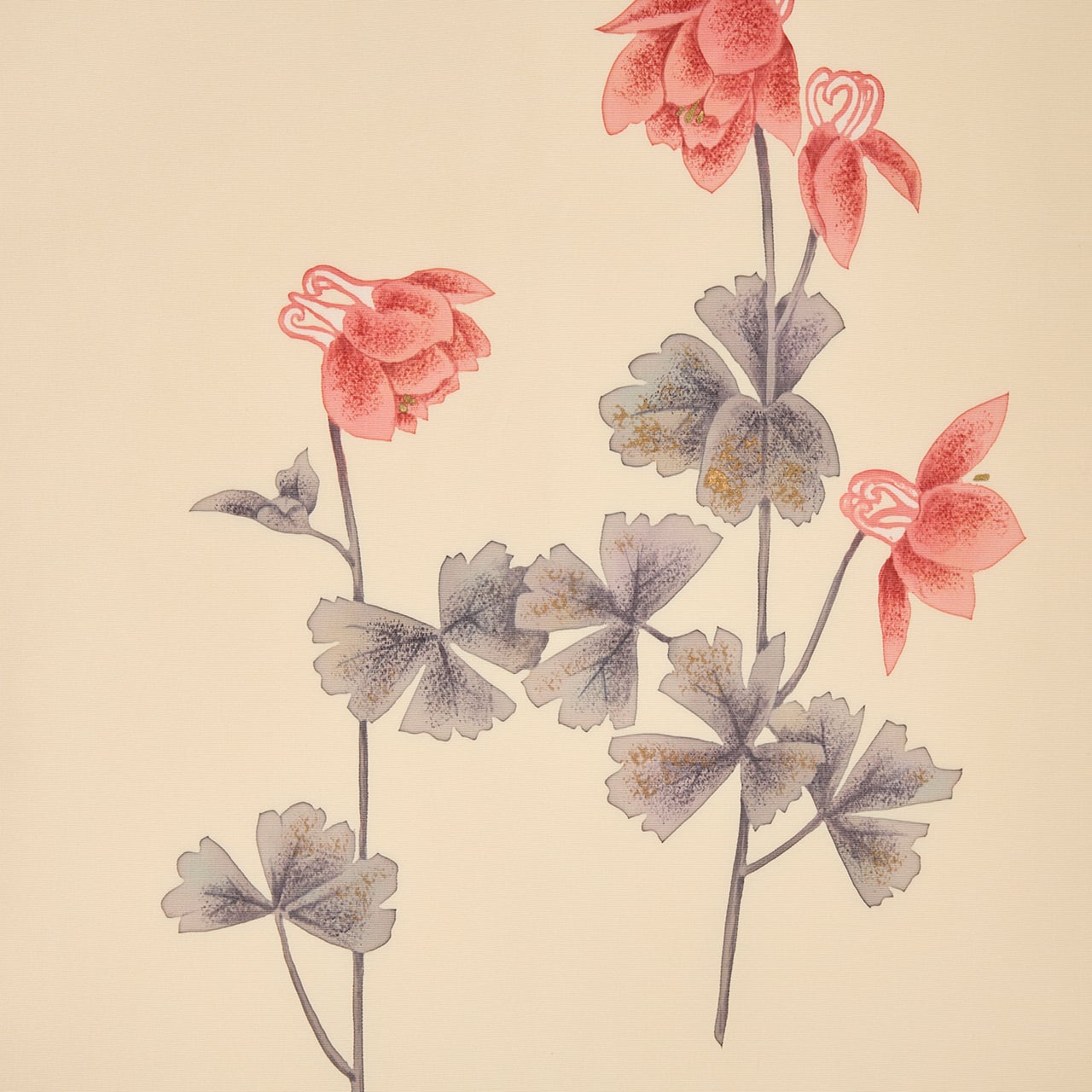 この春、偶然にもオダマキをモチーフにした名古屋帯が2点入荷しましたが、それぞれ個性をご覧いただけると楽しいかと思いました。