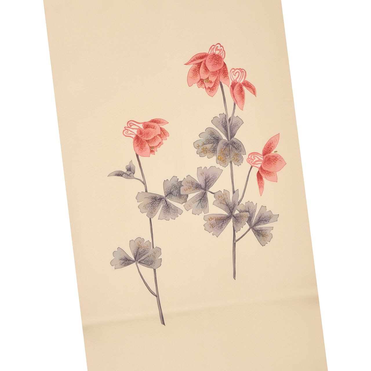澄んだ淡いクリーム・クリームイエローの塩瀬のような生地のお太鼓に、少し大ぶりな2本のオダマキが友禅で描かれた、とても素敵な九寸名古屋帯です。