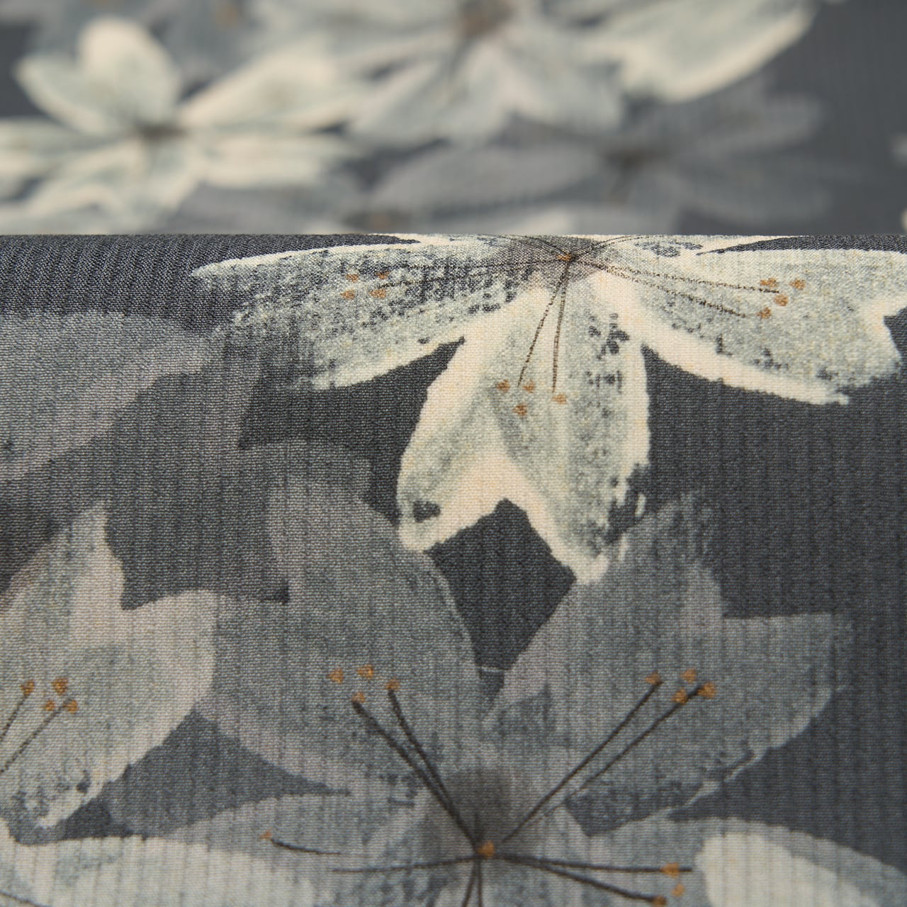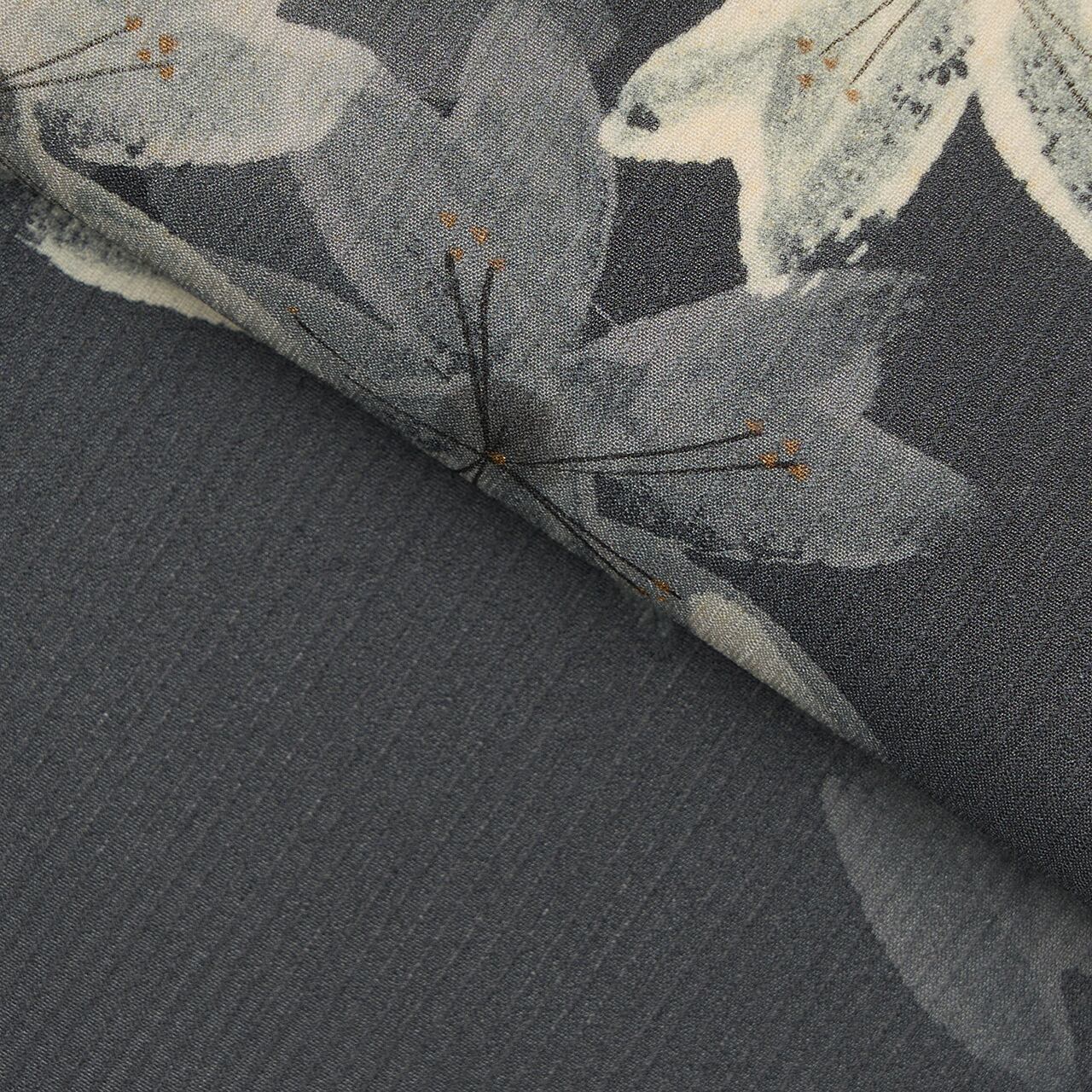 藍味のある濃いグレー・錆鼠色の絽目のような縦縞がある生地に、生成り色から灰青色、そして灰色といったモノトーンの濃淡で、大きめの桜のお花が手描きで描かれた、とてもお洒落な九寸名古屋帯です。