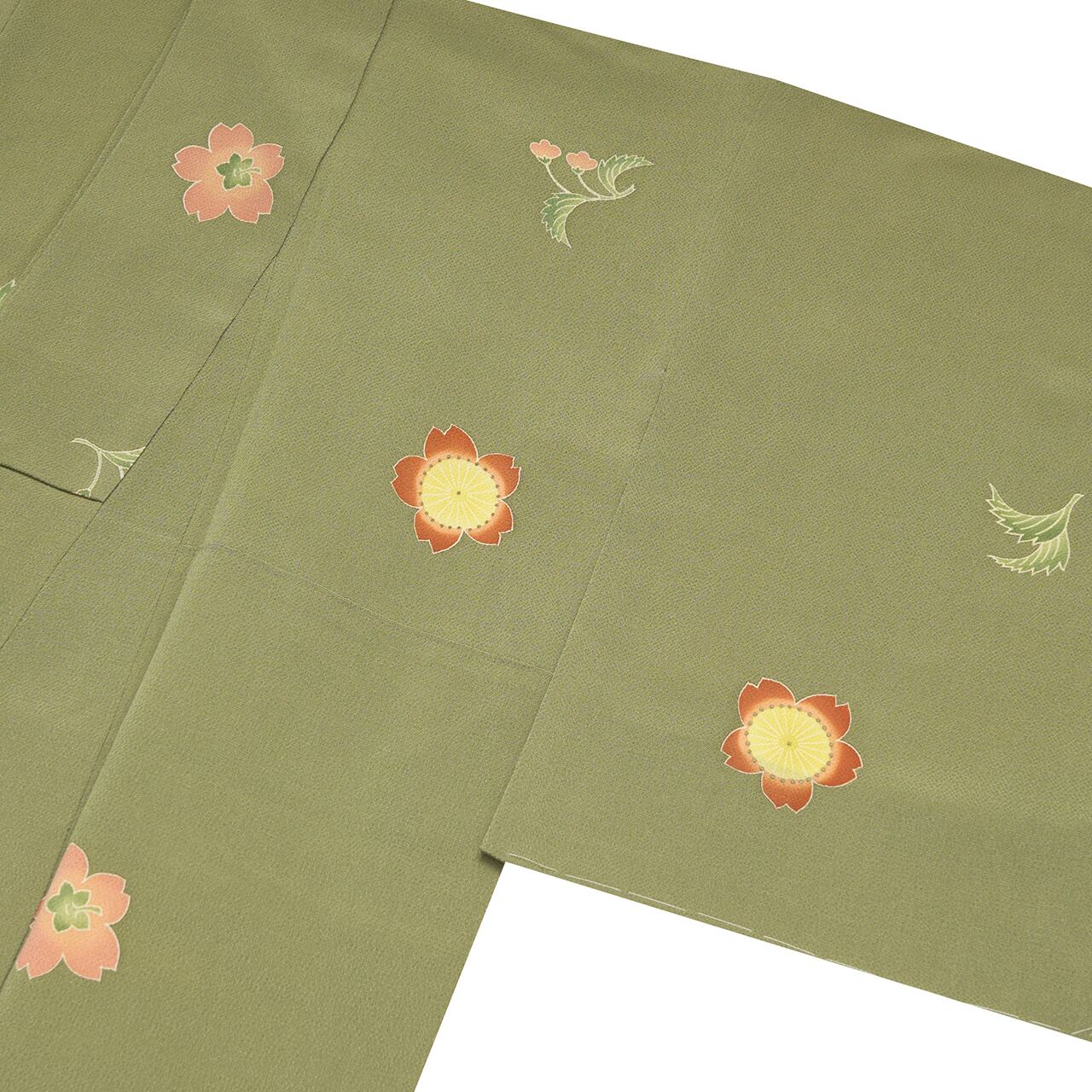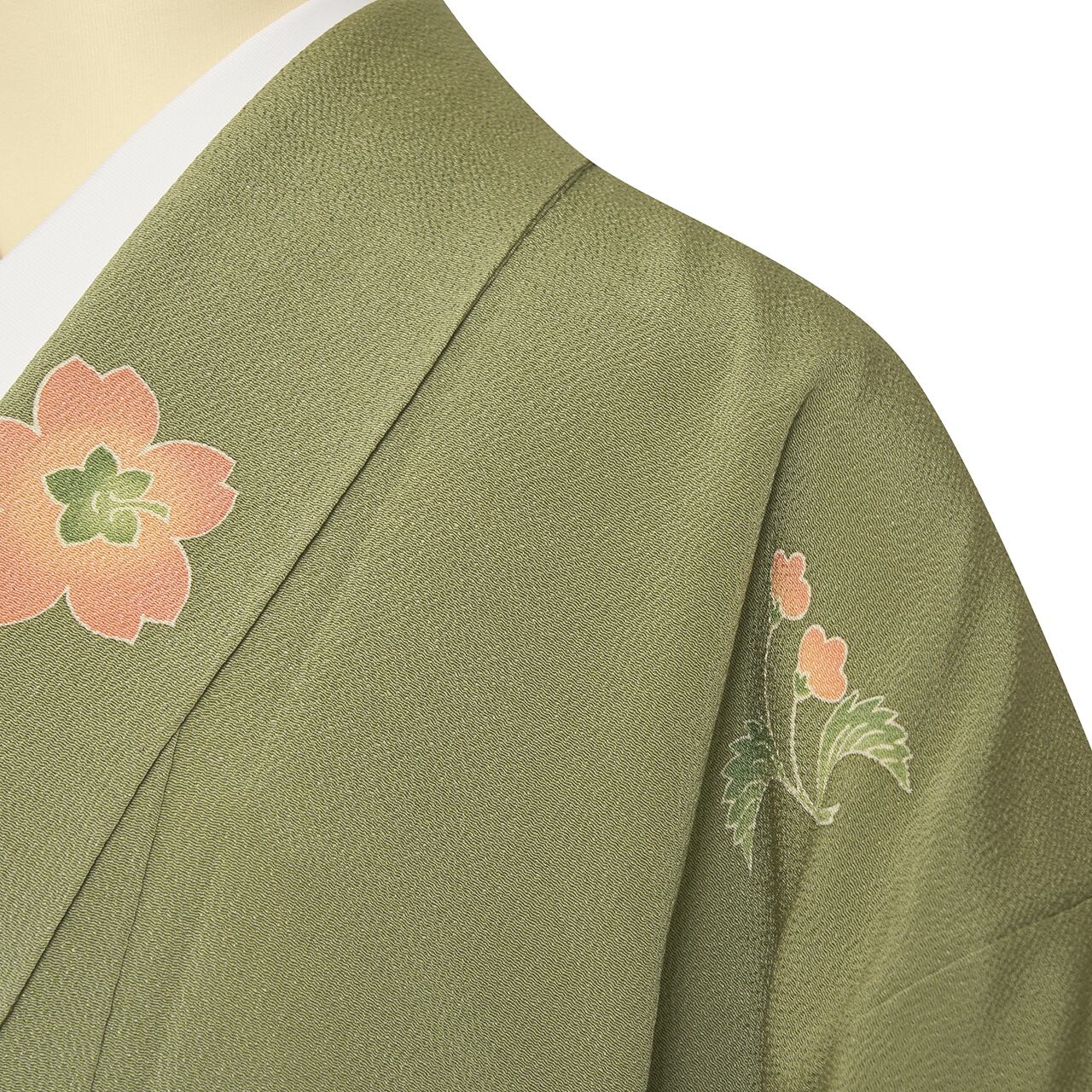 少しシボのある柔らかいちりめん地が淡い鶯色・草色に染められ、パッと咲いた紅色の桜のお花や、白い練色の八重桜のお花、真朱色の蕾や後ろから見たお花の姿など、様々な模様が散らされて描かれた、ホリヒロシさんデザインの素敵な小紋のお着物です。
