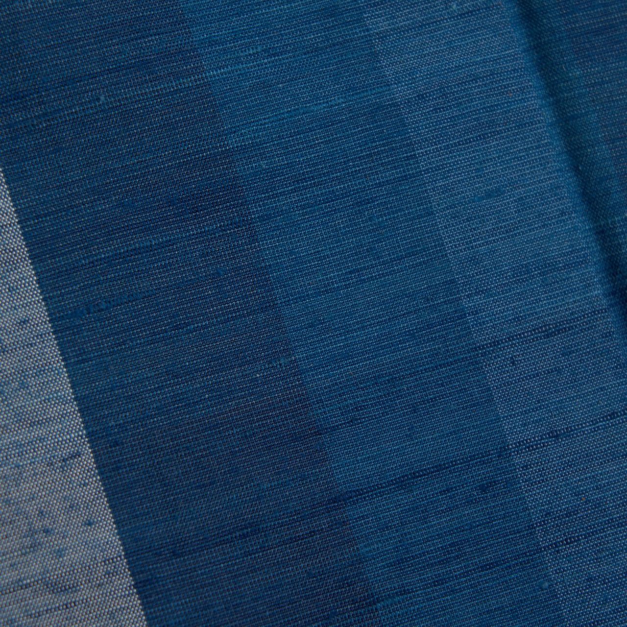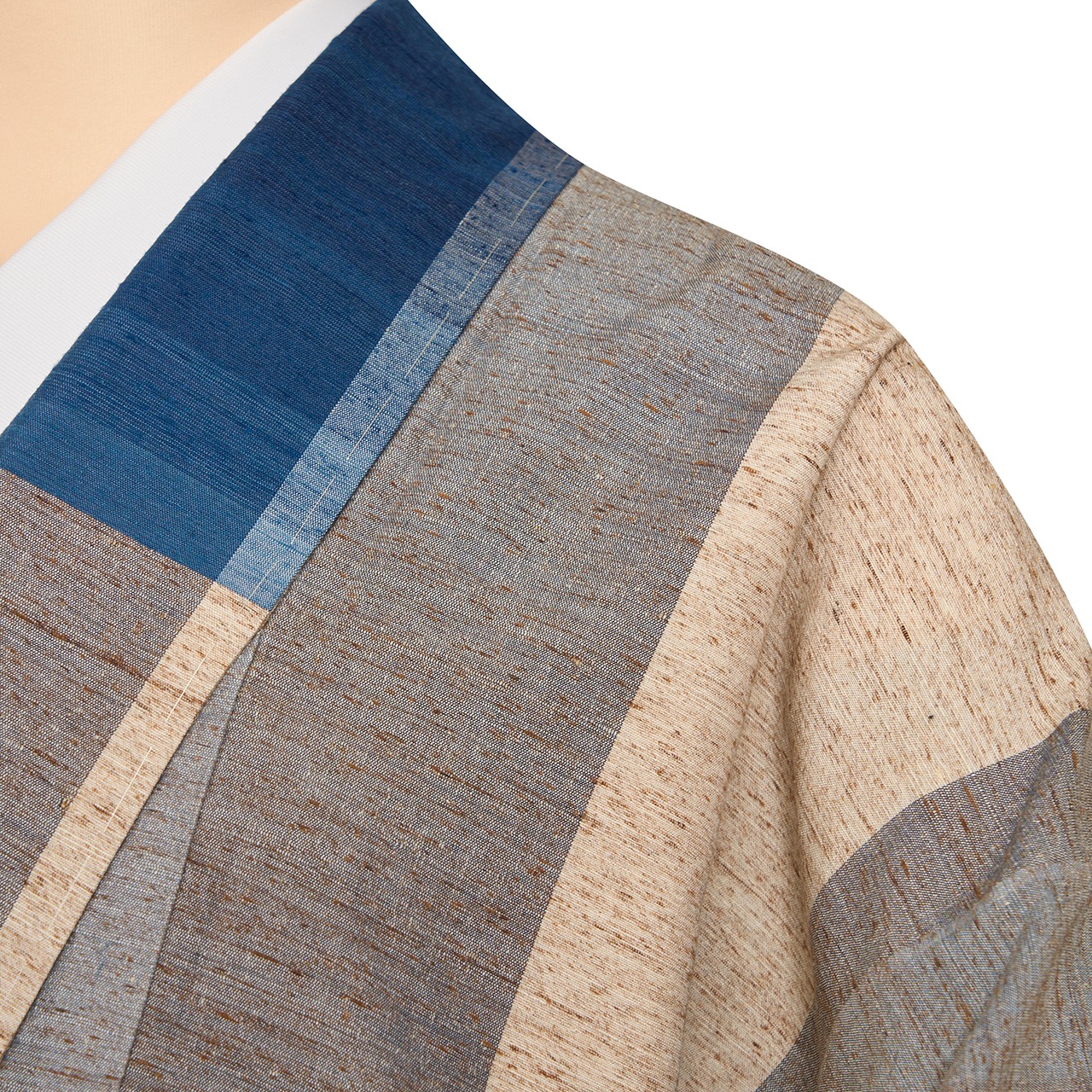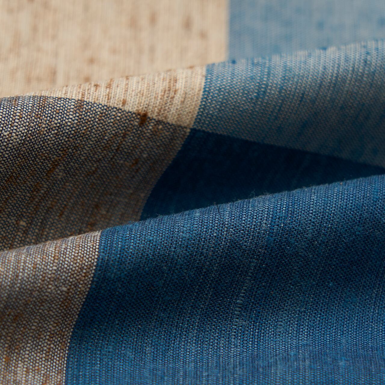 こちらのお着物も、ベージュの自然の色の部分の、ぜんまいの綿の風合いがとても綺麗ですし、藍色の濃淡の縞の模様や、グレーの縞の模様と交差する絶妙な色の変化の美しさなど、目で追っていくだけでも楽しくなってしまうほど素敵です。