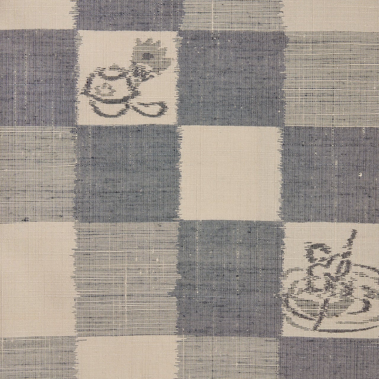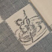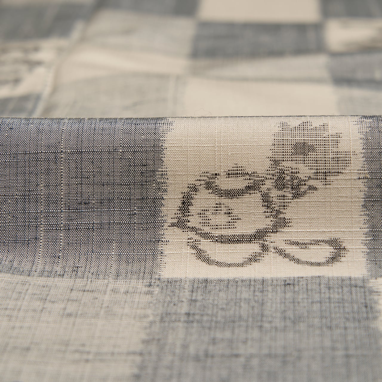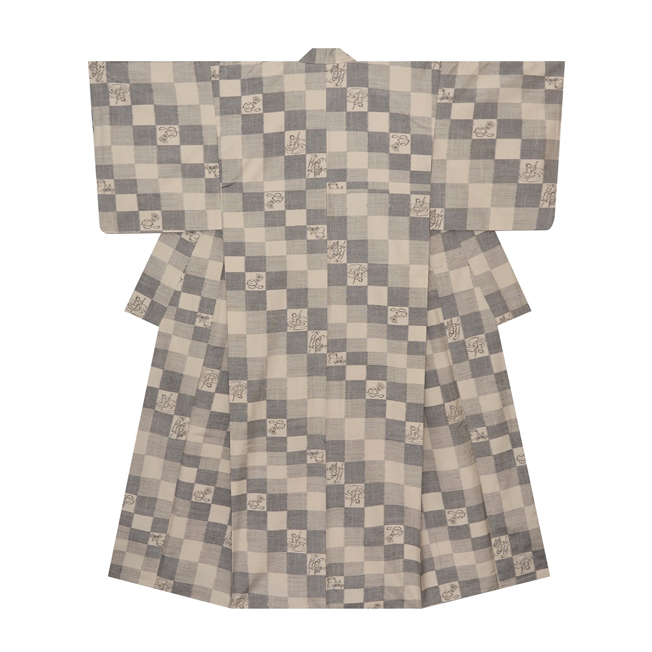 象牙色の紬地に、約6cm角の薄鈍色と鈍色の四角が、変り市松の様な配置に絣で織り出され、象牙色のところには一寸法師やぶんぶく茶釜、かぐや姫、さるかに合戦などの昔話の模様が絵絣で織り込まれた、とても手の込んだ楽しいお着物です。