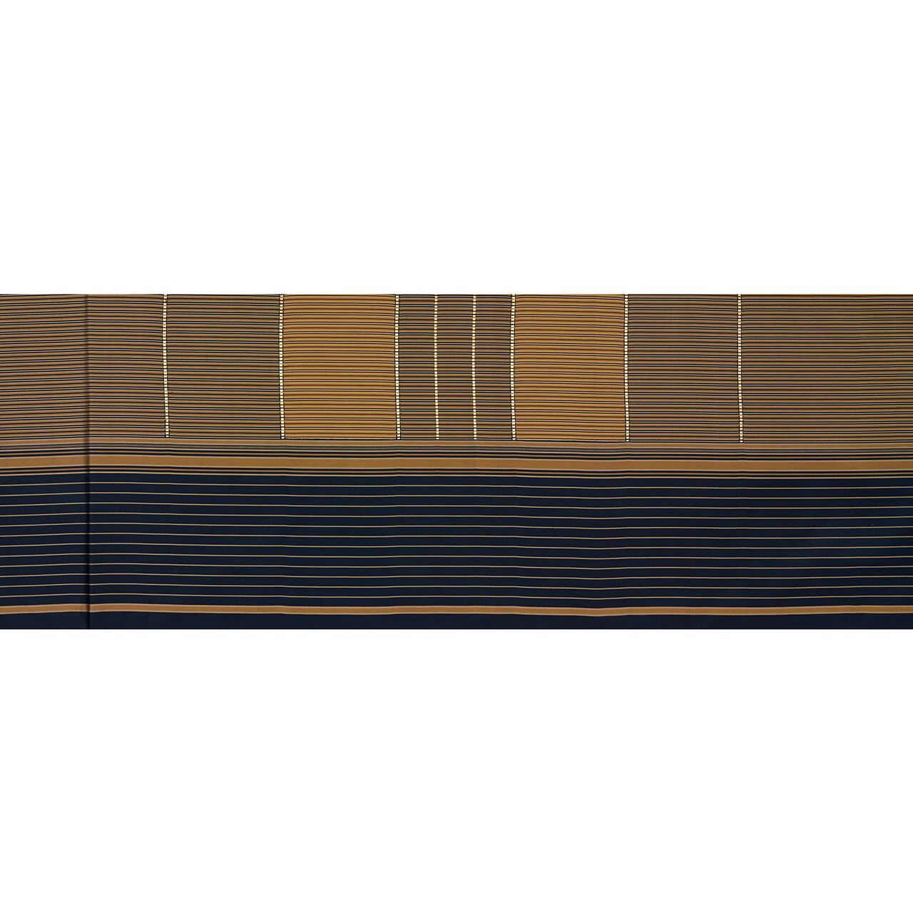 青褐色と黄橡色とのコントラストが綺麗で、静かで整然とした佇まいには茶道にも通じる格調の高さもあり、帯として趣味の良さが感じられます。