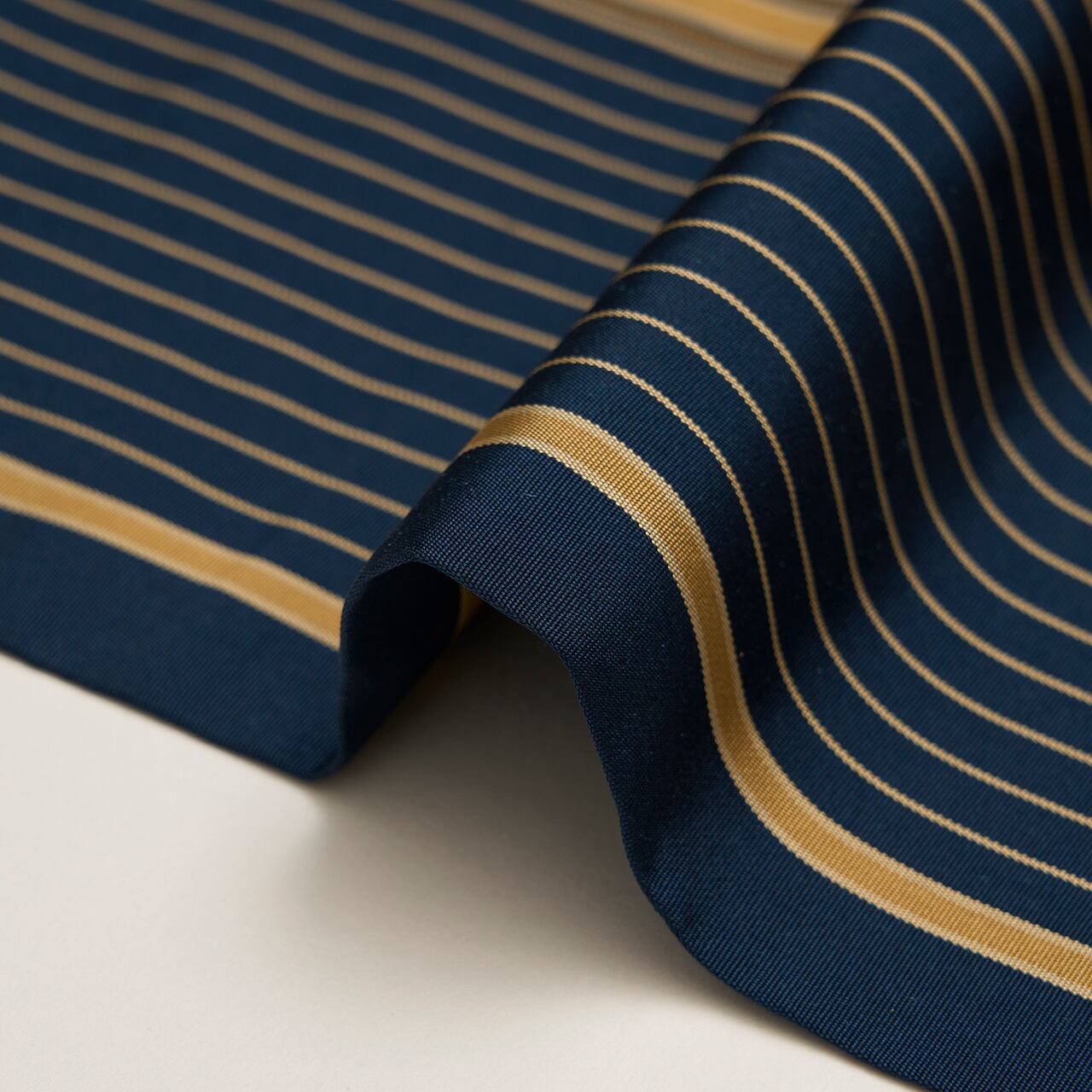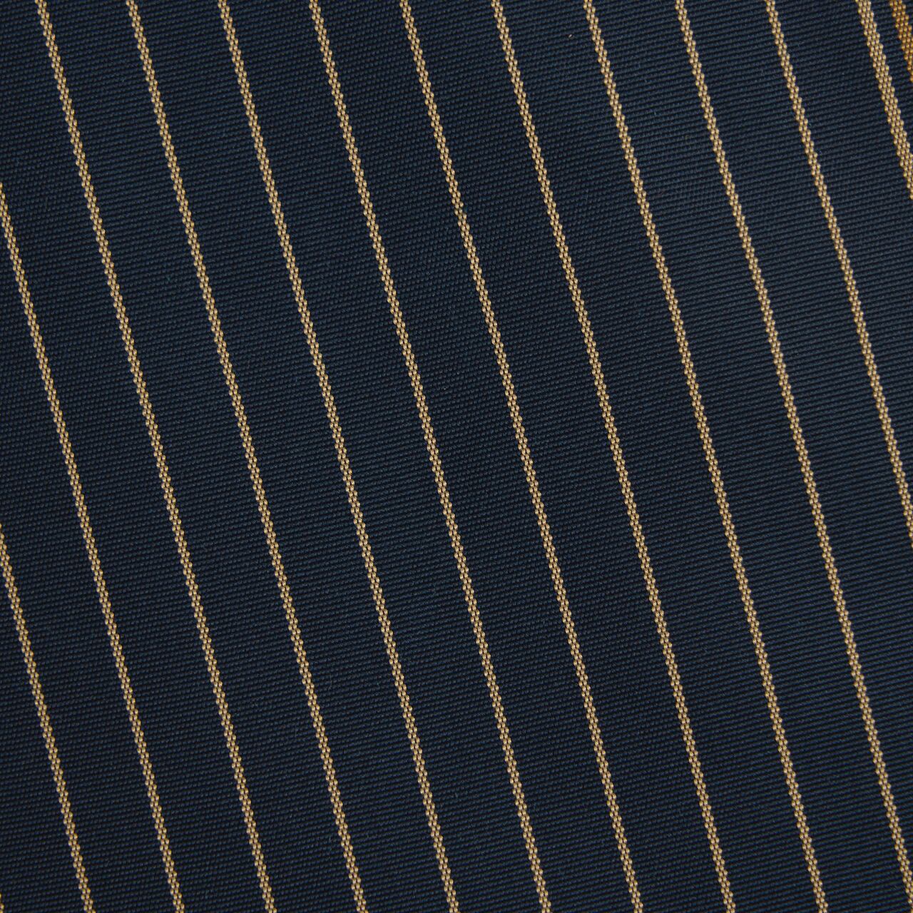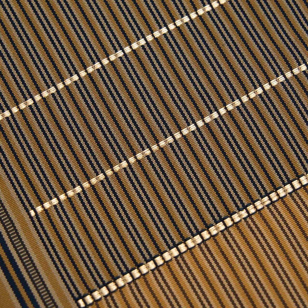 お太鼓の右側に金糸で区切られた段が置かれて、色を変えながら細かい縞が緻密に織り出され、左側はピンストライプの様な藍色地に黄橡の細い線が走る縞のコントラストが美しい、お洒落さが際立つ龍村平蔵製の「名物船越間道手」の本袋帯です。