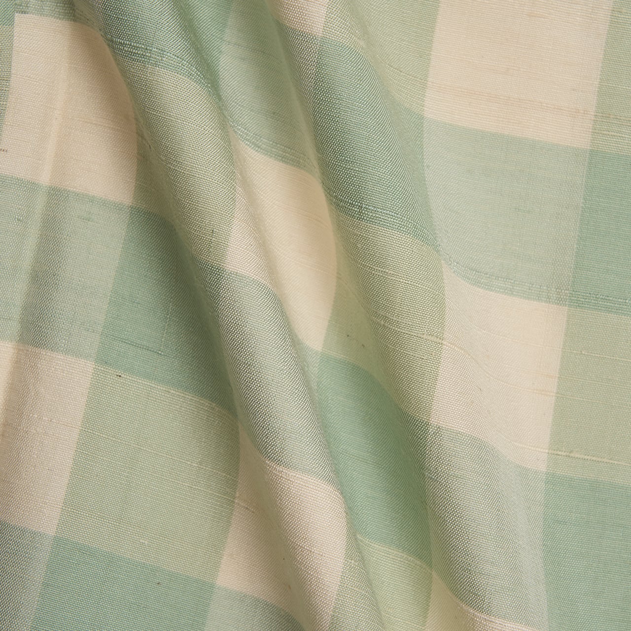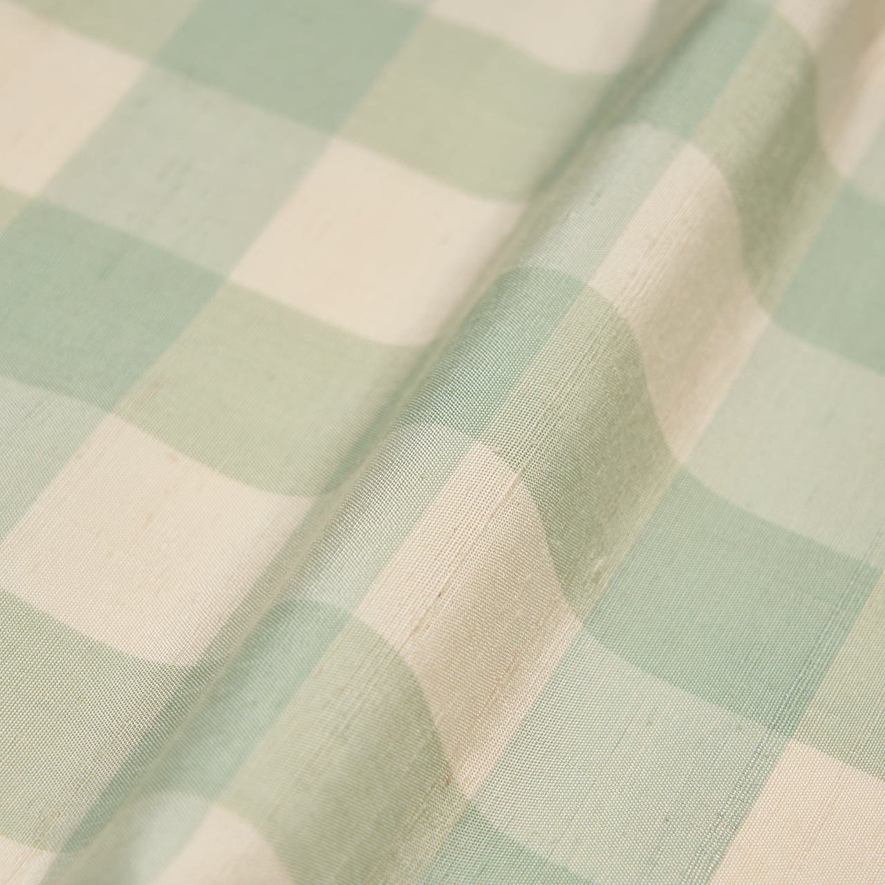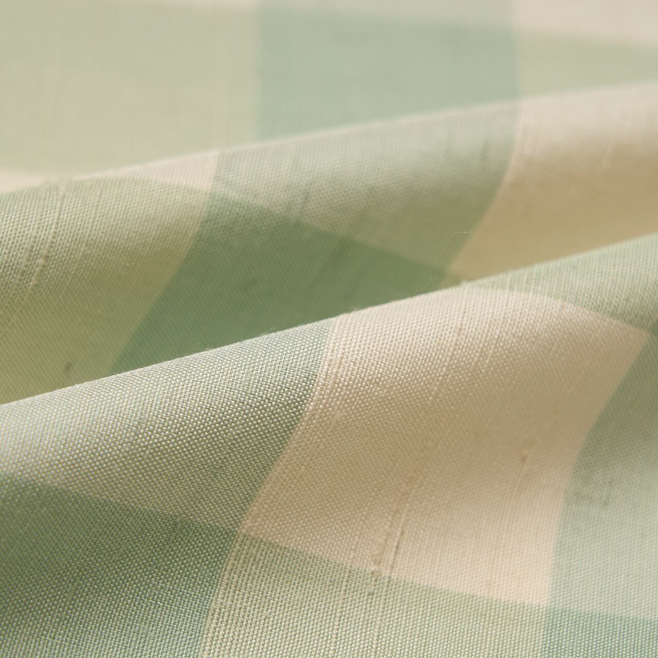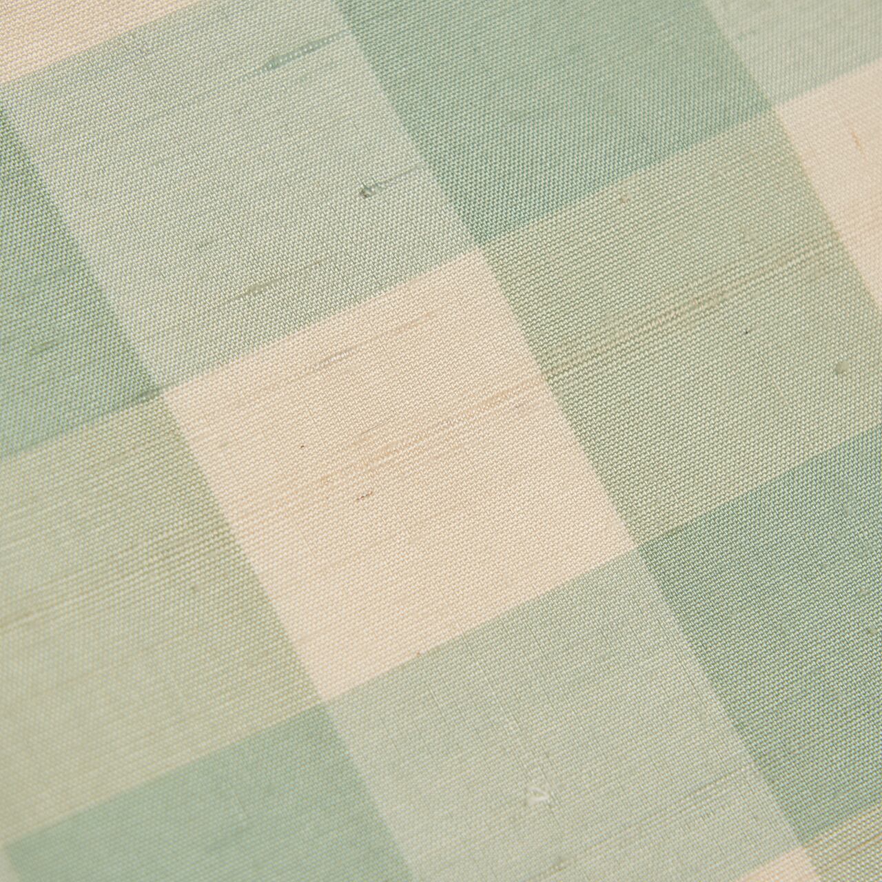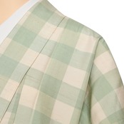緯糸に節のある座繰りの象牙色の紬地に、藍の生葉で染められた透明感のある薄萌葱色の格子が経緯に織り出された、爽やかでお洒落なお着物です。