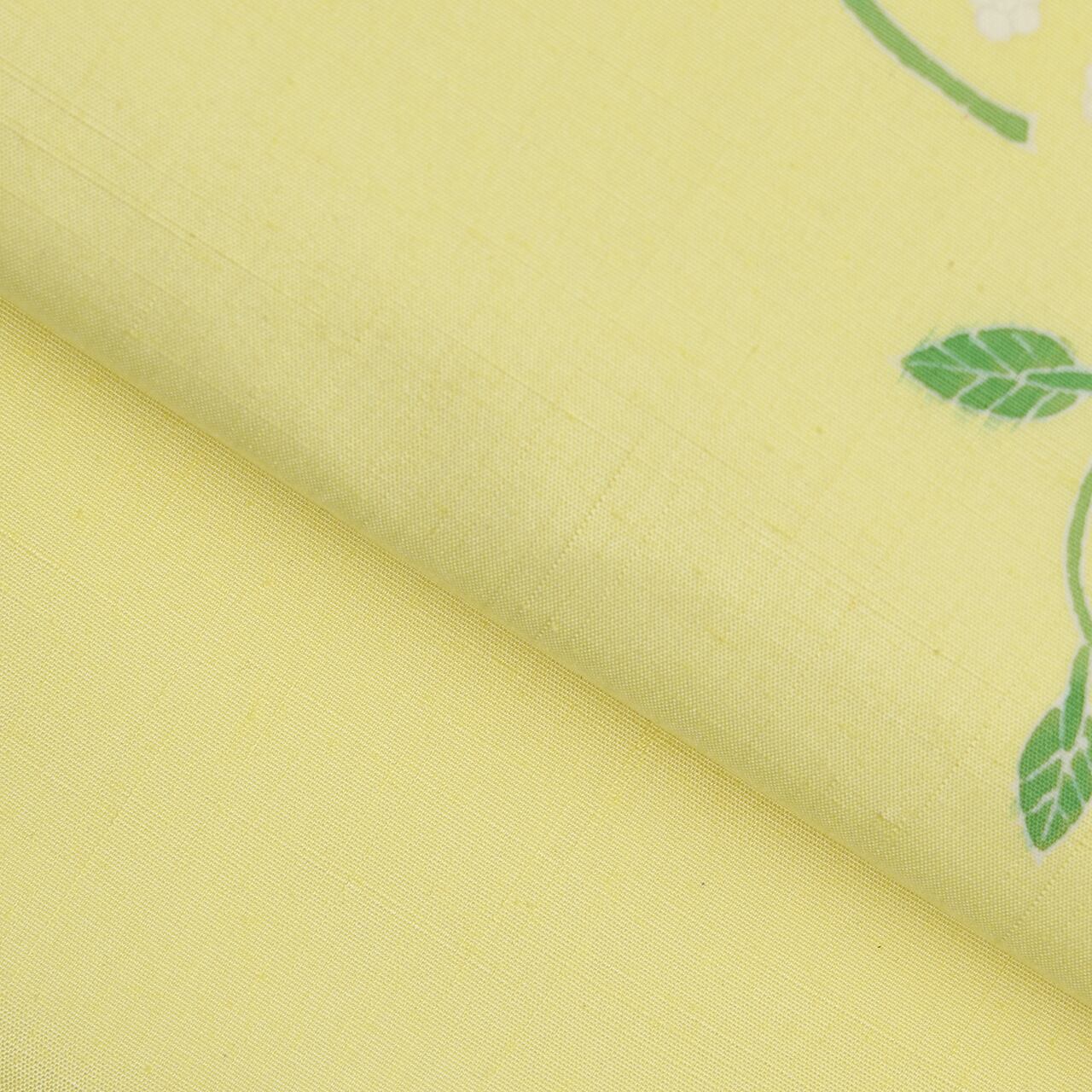 綺麗なレモンイエロー・女郎花色のふっくらとした紬の生地に、可愛いお花が並んで咲く様子が友禅で描かれ、花びらや葉には手刺繍が施された、楽しい雰囲気の九寸名古屋帯です。