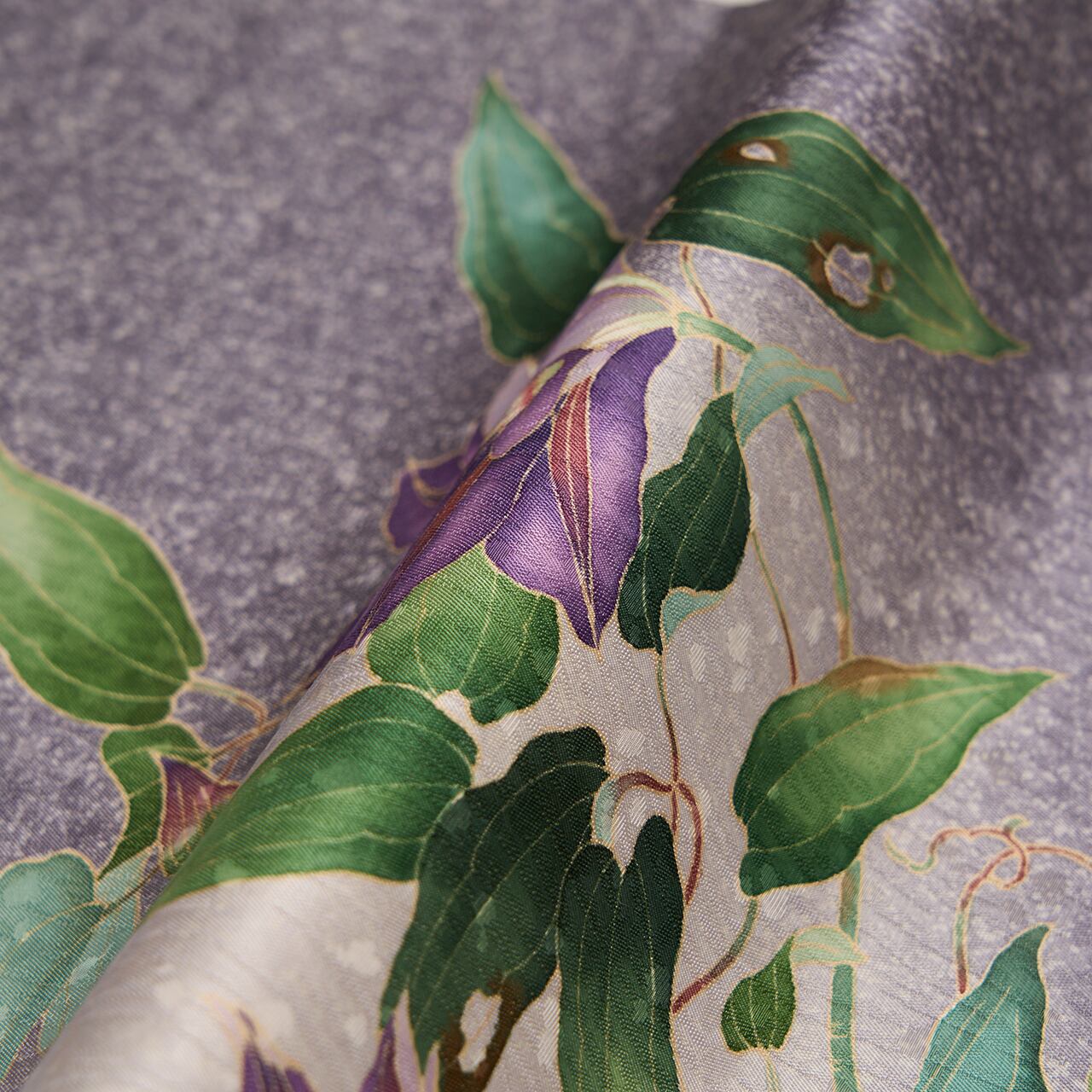 立涌の地模様のある生地が蝋散らしで淡い藤色・濃鼠色に染められ、それを背景にテッセンのお花が活き活きと、思わず手で触れてみたくなるほど写実的に描かれていて、見入ってしまいます。
