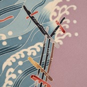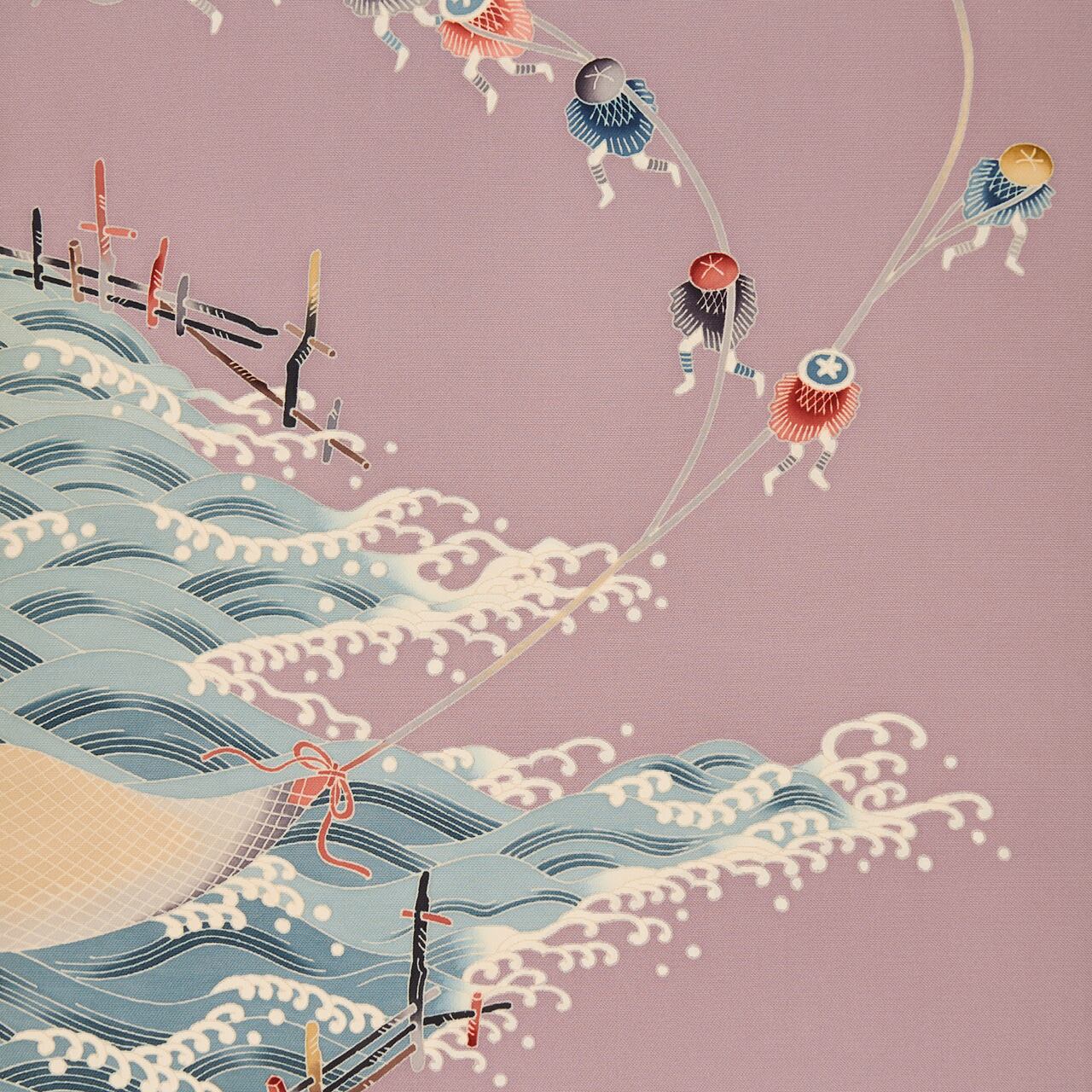 独創的な構図もバランスの取れていて、押し寄せる波の波頭の美しさや、曳網の網目の糸目友禅の繊細さ、人物の躍動感など、見どころの多い作品です。