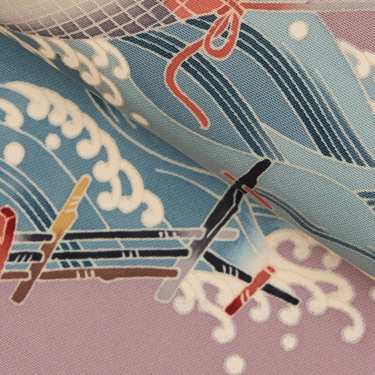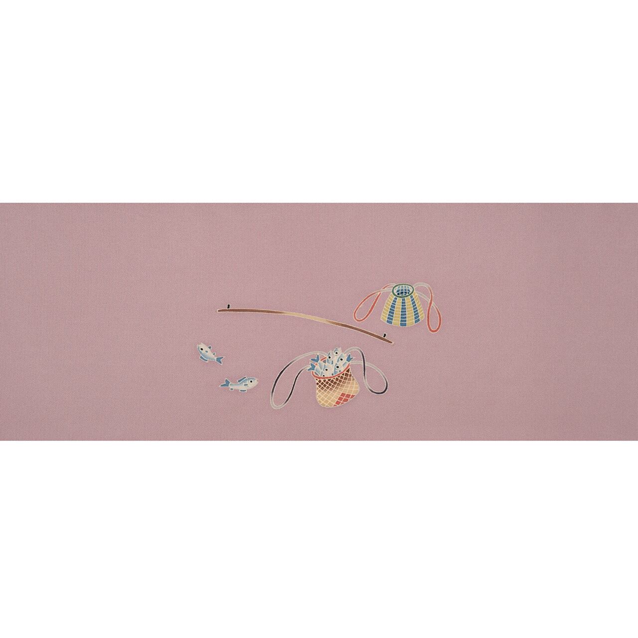 明るい薄紫・薄色の塩瀬の生地の、お太鼓の左下から綺麗な波が押し寄せ、そこから浜辺に網を引く人々の姿が細密な手描友禅で表された、奥原逸就さんの素晴らしい九寸名古屋帯の作品です。