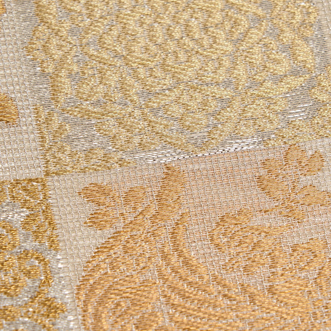 ひと幅が約4分割され、天平華文のような文様や鳳凰、龍、花の下に佇む鴛鴦など、様々な模様が微妙に色の違う金糸で織り出された、大変豪華な印象の袋帯です。