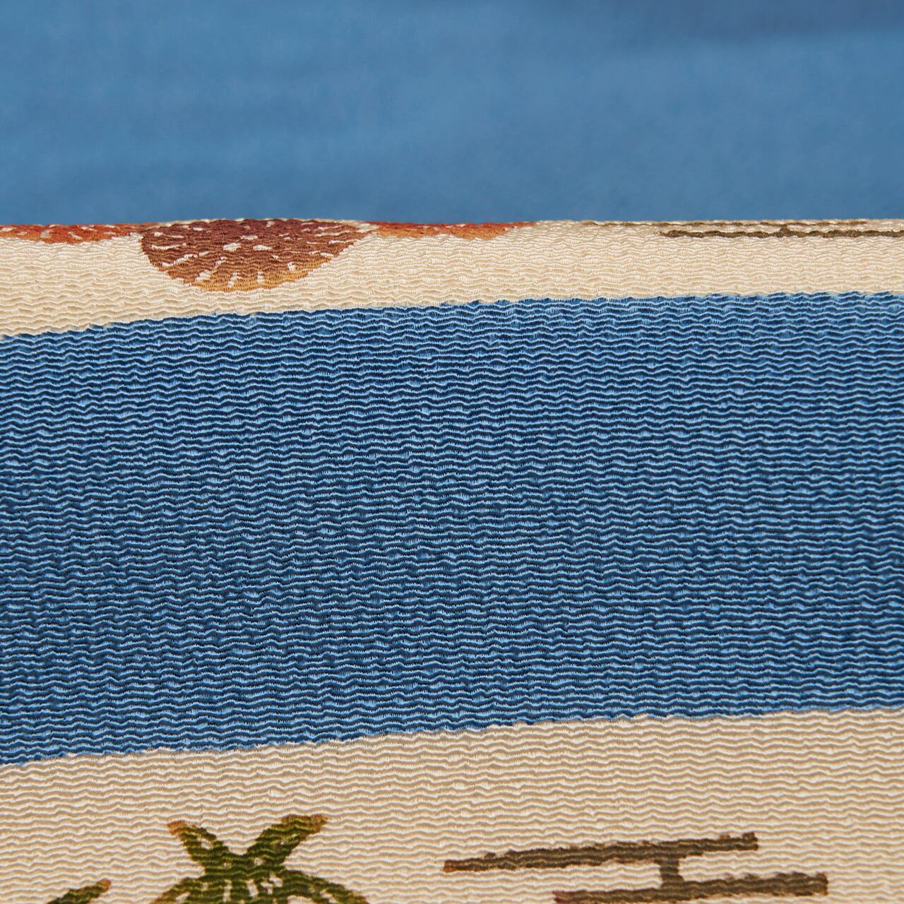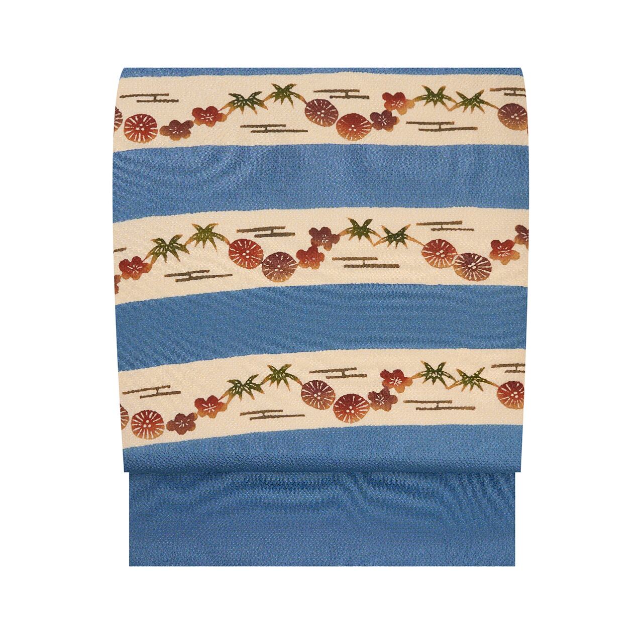 少しシボのあるちりめん地が、明るい藍・薄縹色に染められ、お太鼓に3段ほど象牙色が染め残され、その中に梅と松と竹がディフォルメされた図案が型絵染で染められた、楽しい雰囲気の九寸名古屋帯です。