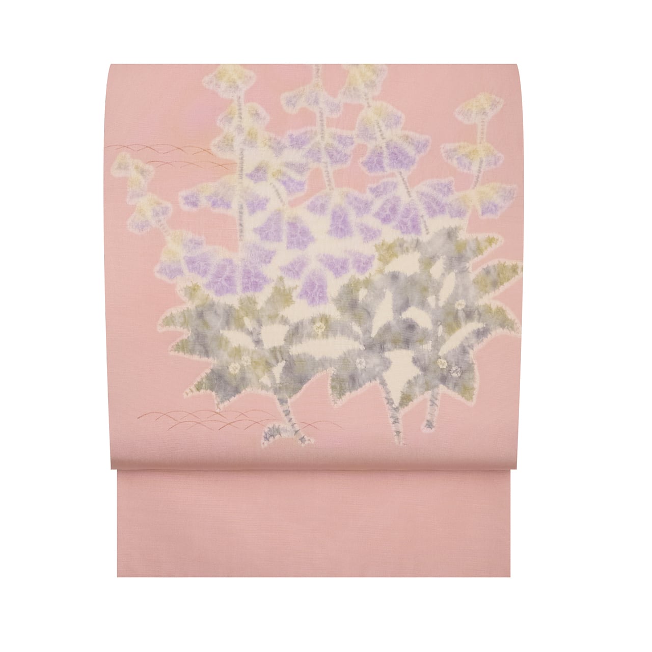淡いピンク・虹色の塩瀬の生地に、今を盛りに咲き競うようなカンパニュラのお花が絞り染めと友禅で描かれた、日本工芸会正会員の福村廣利さんの九寸名古屋帯の作品です。