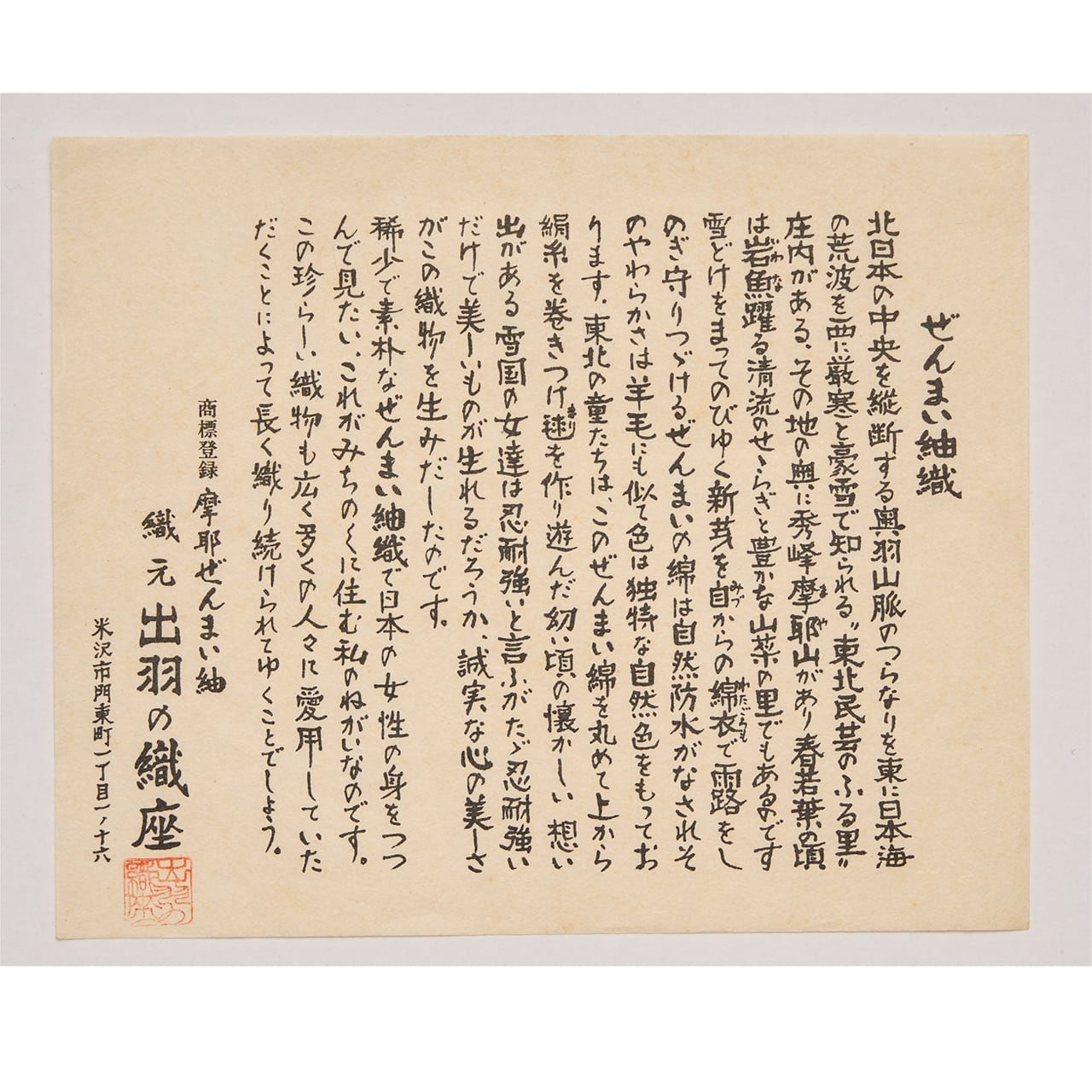 小さな冊子が付けられていますが、そこにはぜんまいそのものと、その綿、それを紡いでできた糸などが添えられていて、それを拝見しますと、どれほどの手間と労力と時間をかけてつくられたのかと、改めて考えさせられました。