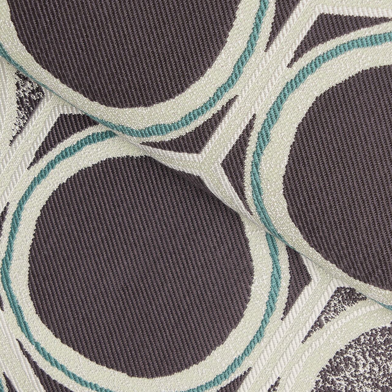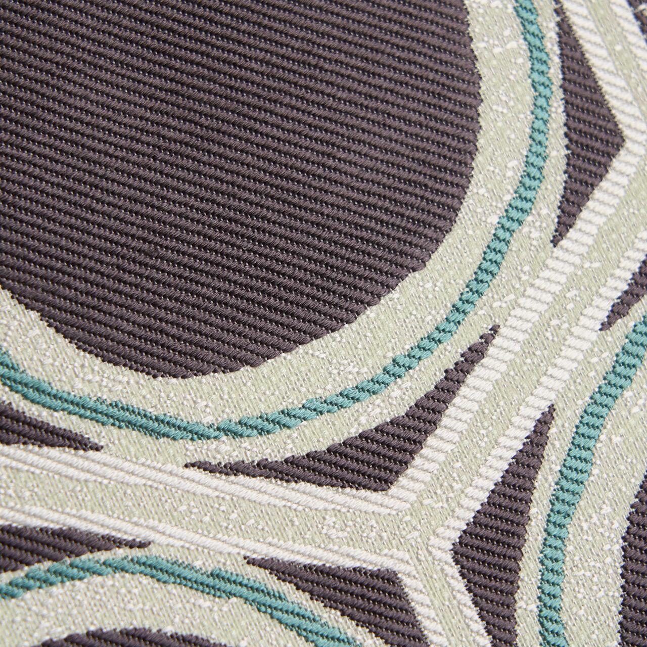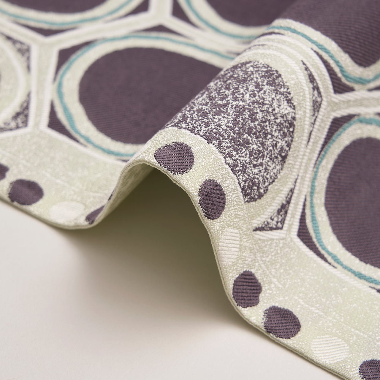 白に近いような浅い草色・夏虫色の霰のような地模様のある地に、両端にはボーダーが取られ、そこには小さな丸い模様が、藍墨茶色と白で並んで織り出され、中心には大きな亀甲の中に丸が織り込まれた、モダンなデザインの幾何学模様の袋帯です。