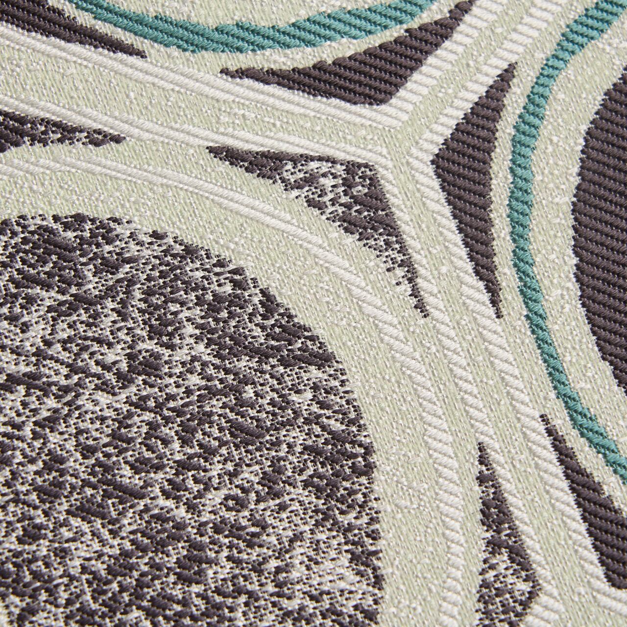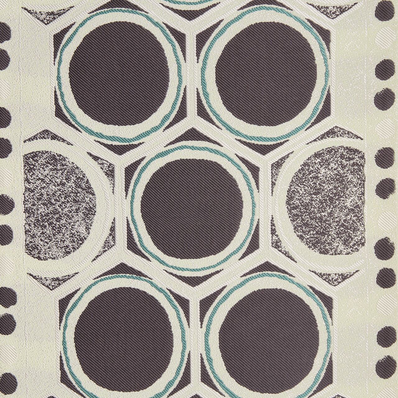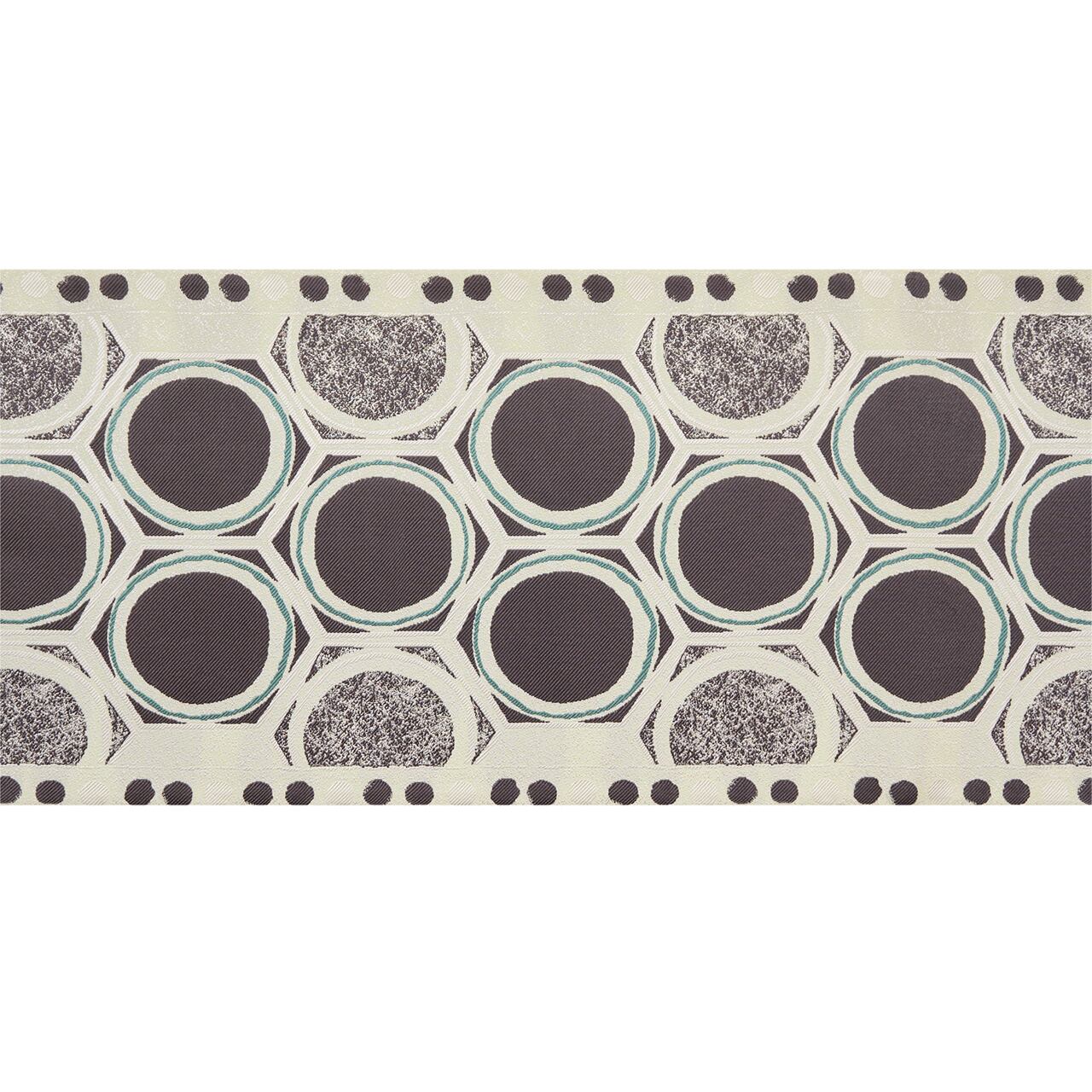 白に近いような浅い草色・夏虫色の霰のような地模様のある地に、両端にはボーダーが取られ、そこには小さな丸い模様が、藍墨茶色と白で並んで織り出され、中心には大きな亀甲の中に丸が織り込まれた、モダンなデザインの幾何学模様の袋帯です。