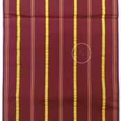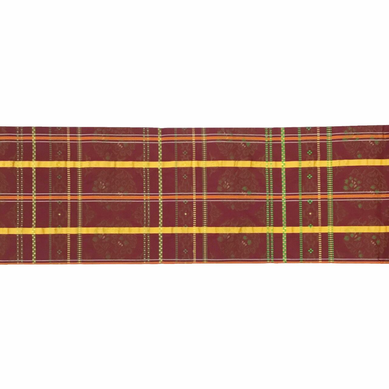 葡萄茶色の地に、鬱金色、赤橙色、白色の縞が縦に走り、横には明るい緑色の縞が破線のように織り出され、格子の模様となった九寸名古屋帯です。