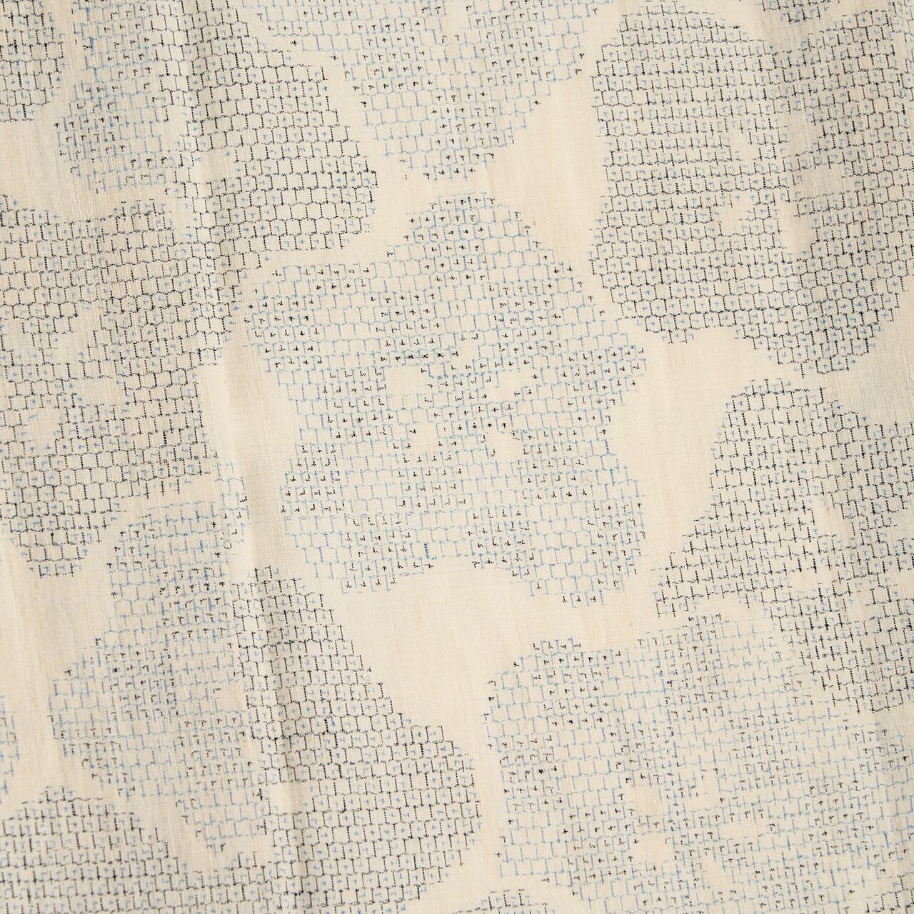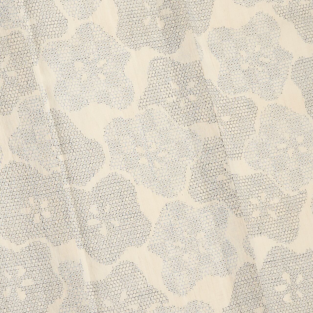 ふんわりとしたしなやかな象牙色の地に、濃い藍色と少し明るい藍・青藍色の濃淡の糸で、80亀甲の絣で構成された手のひらほどの大きさの梅のお花が、少し重なるように織り出された、本場夏結城の単衣のお着物です。
