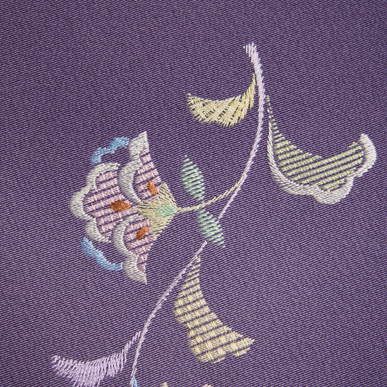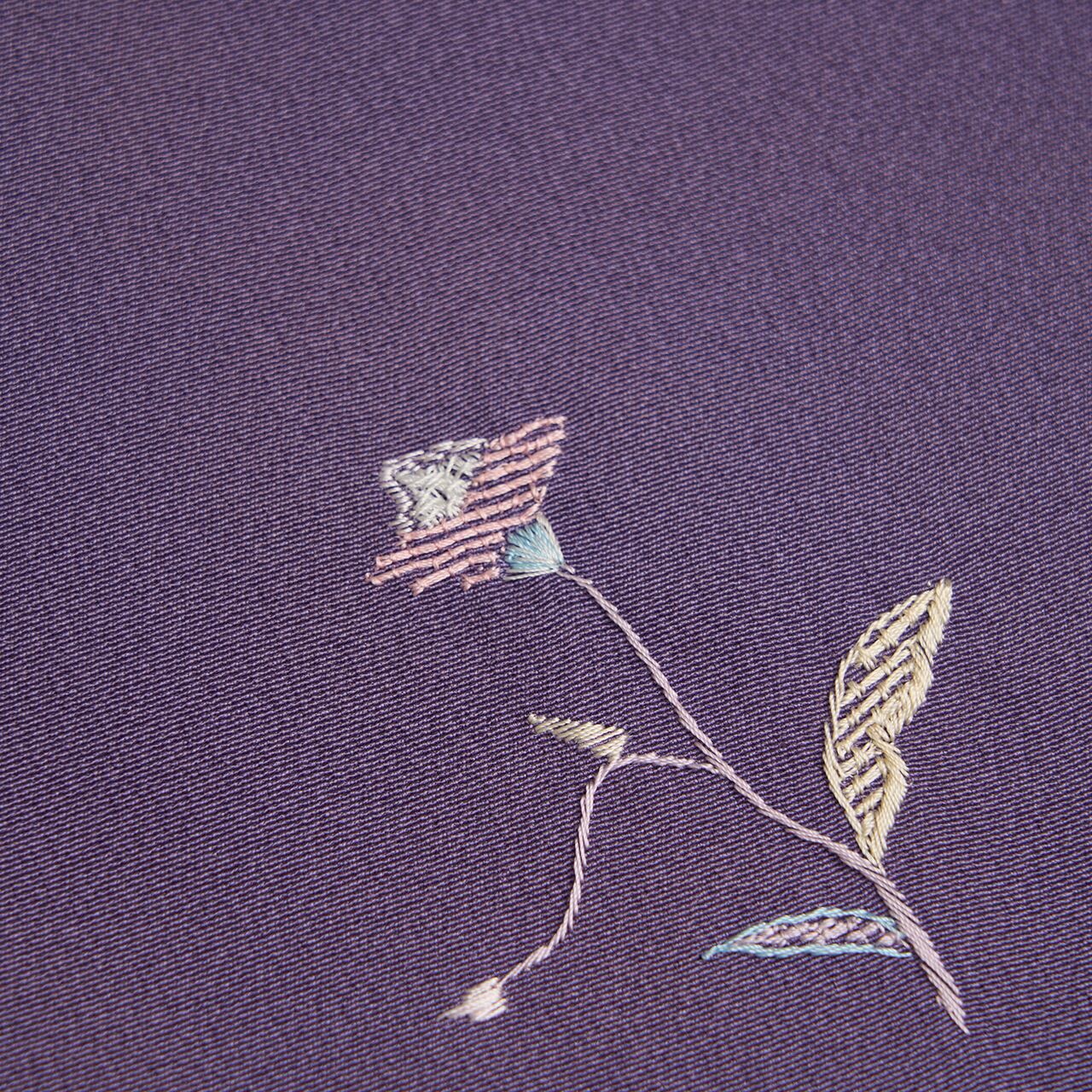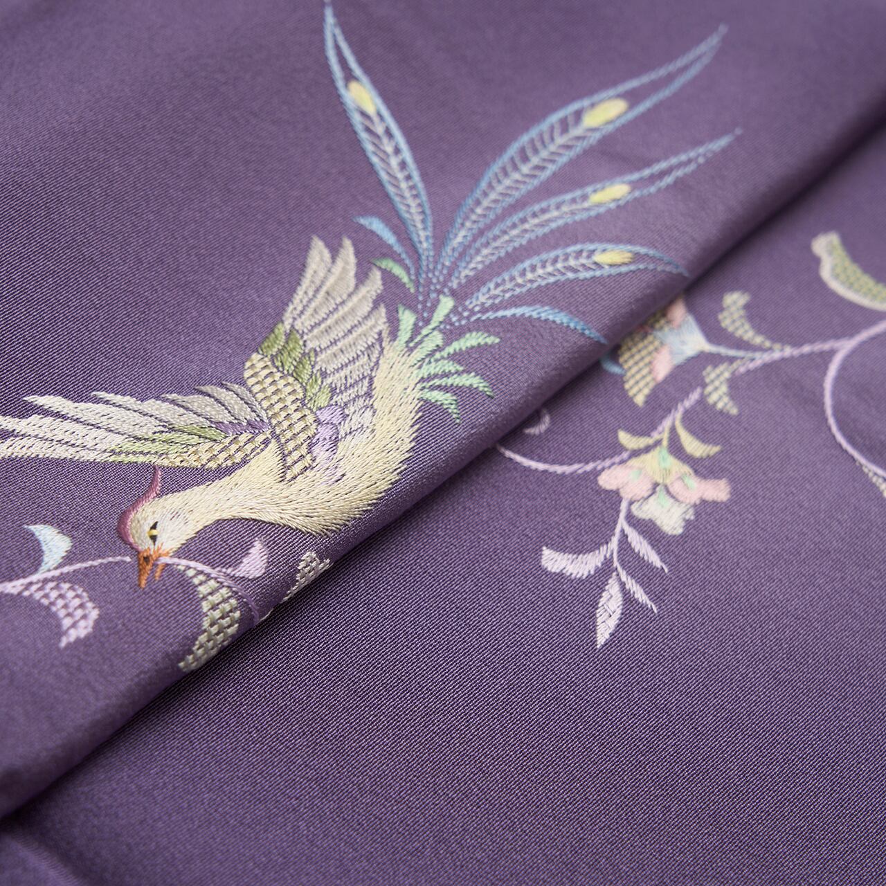 とても澄んだ、そして奥行きのある美しい紫・紫苑色の一越の生地に、可憐なお花をつけた枝が舞い、上前と後身頃にその枝を咥えた姿の良い鳥が飛び交う様子を細やかな手刺繍で表された、品格のある森康次さんの附下のお着物の作品です。