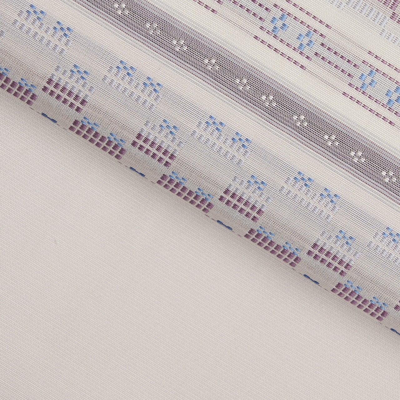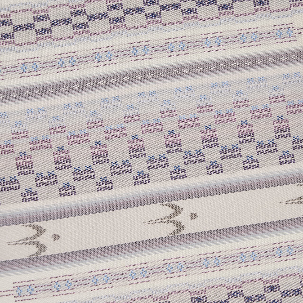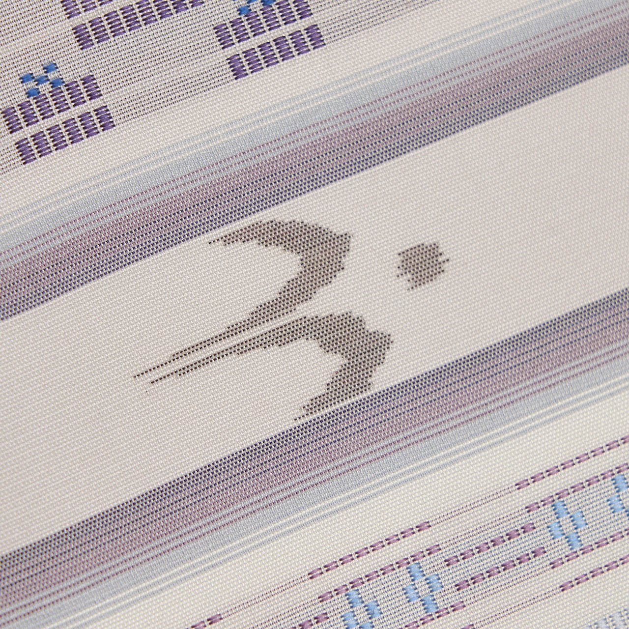 こちらは紗のような極細の糸で織られた地に、グラデーションのある縞模様とツバメの絣が段変わりに織り込まれ、その間を絶妙な色使いの花織が埋めるといった大変お洒落なデザインと色合いとなった、ハイセンスな九寸名古屋帯です。
