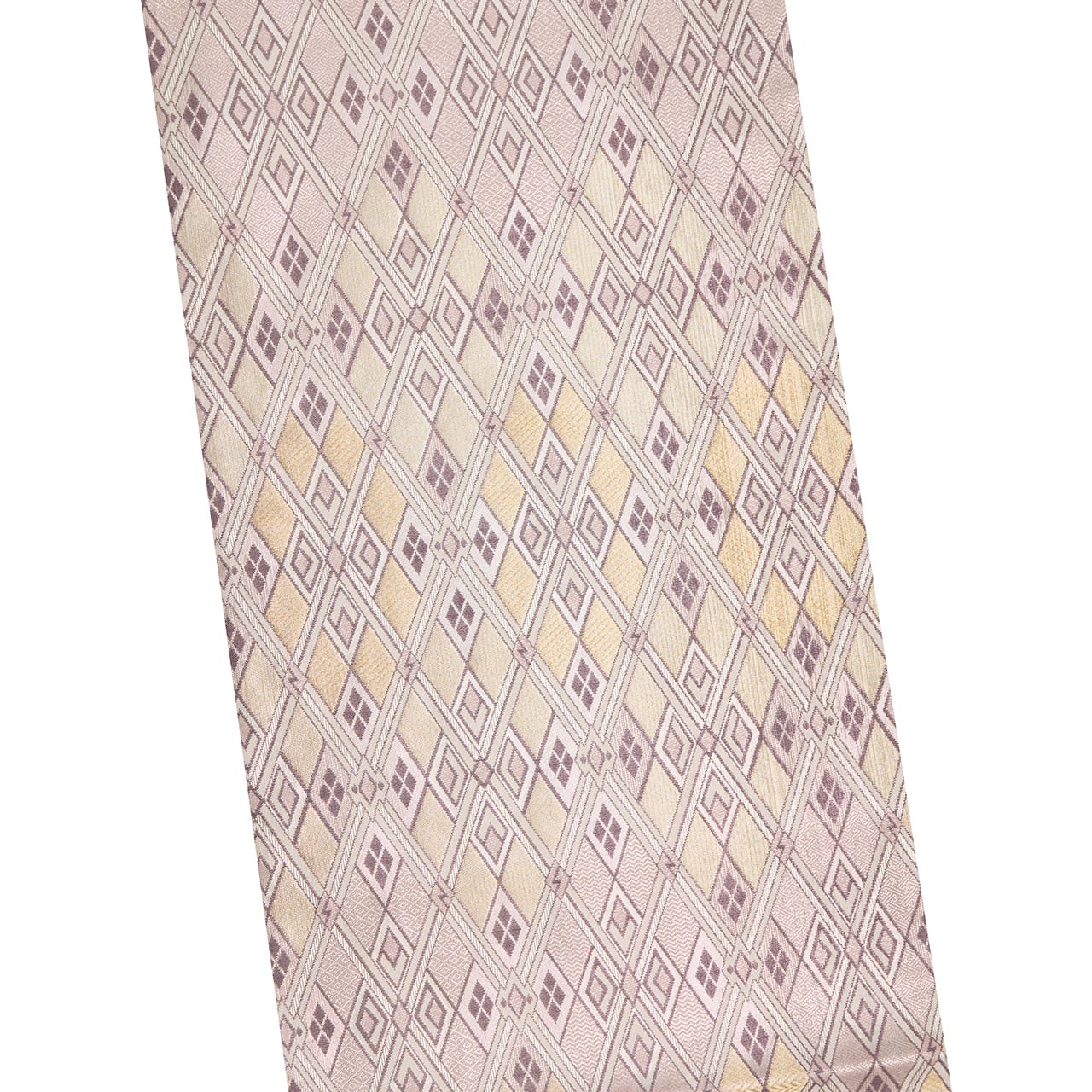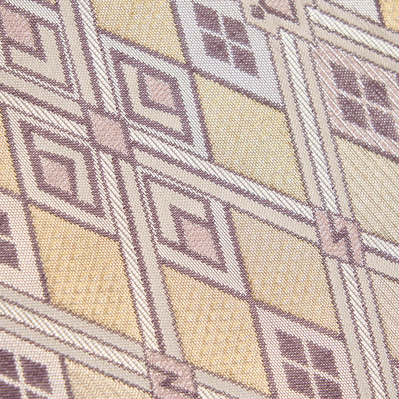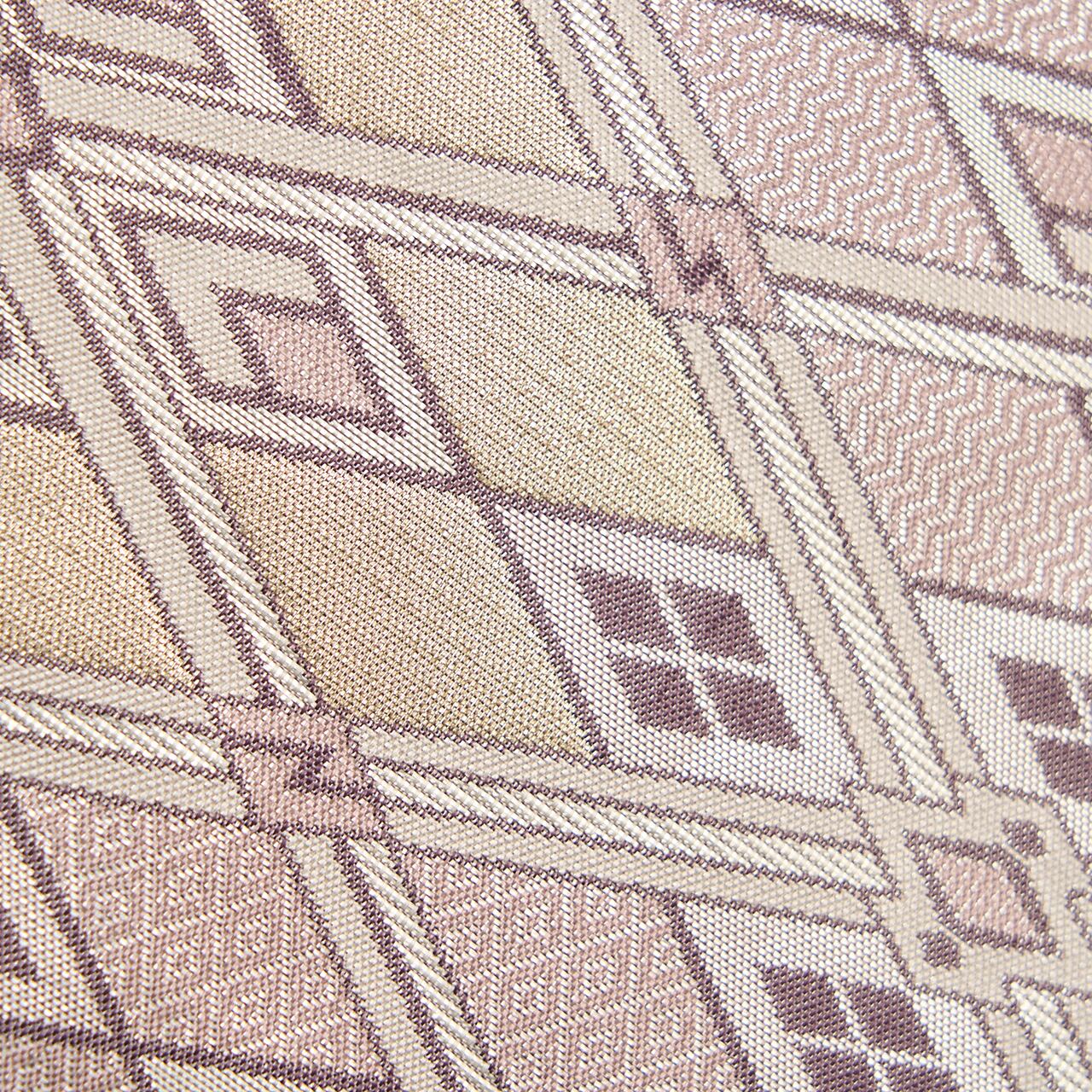 銀色と薄梅鼠色との組み合わせが大変お洒落で、重なる菱の文様にもシャープさと気品があり、フォーマル用の帯としてはとても珍しいタイプのものと思います。