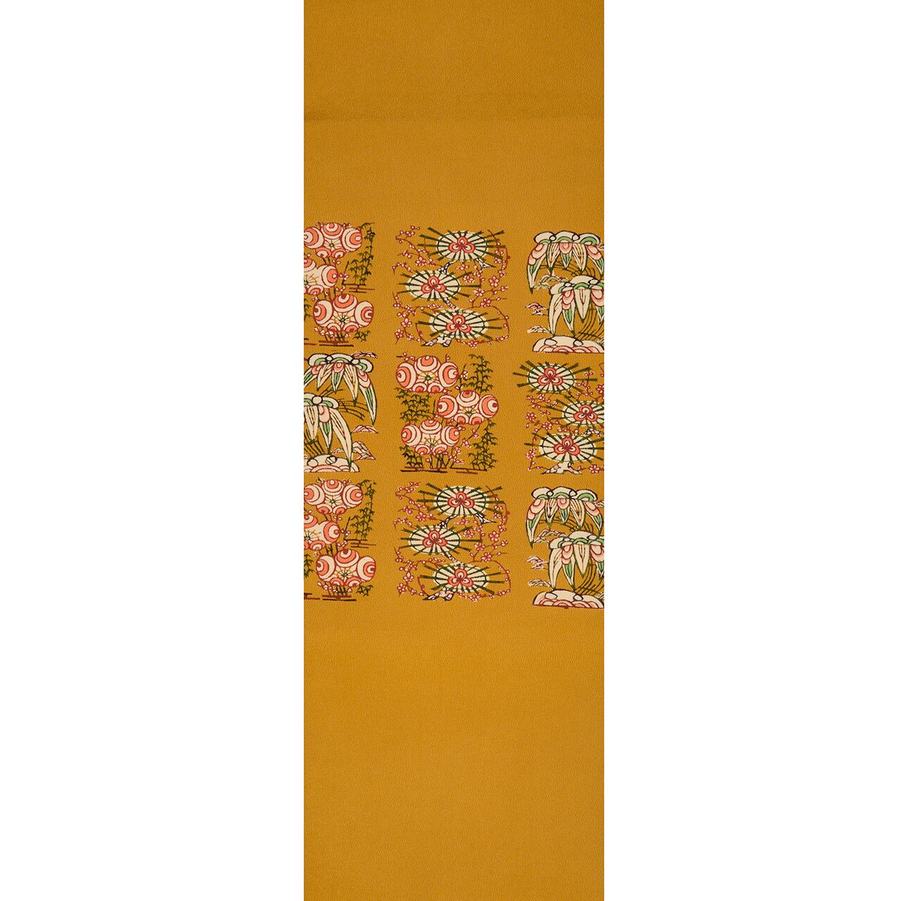 少しシボのあるちりめんの生地が綺麗な芥子色に染められ、大きめの四角の形に、少しユーモラスにディフォルメされた松竹梅の模様が型絵染で描かれた、とても素敵な小島悳次郎さんの九寸の開名古屋帯の作品です。
