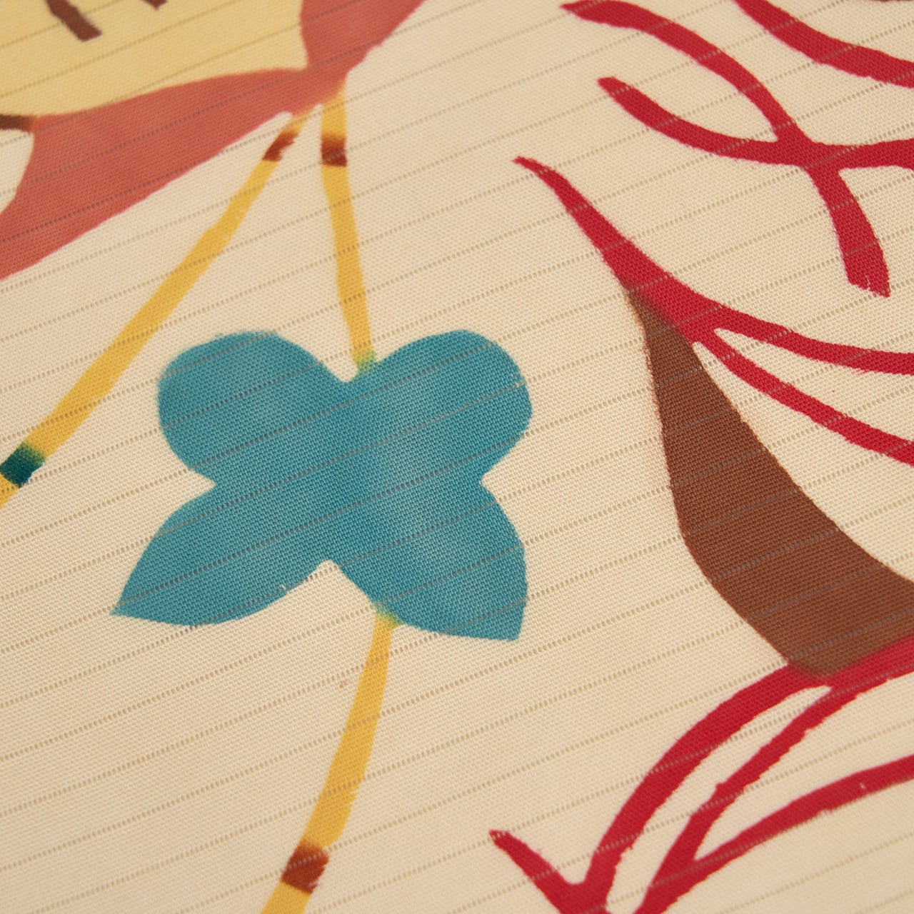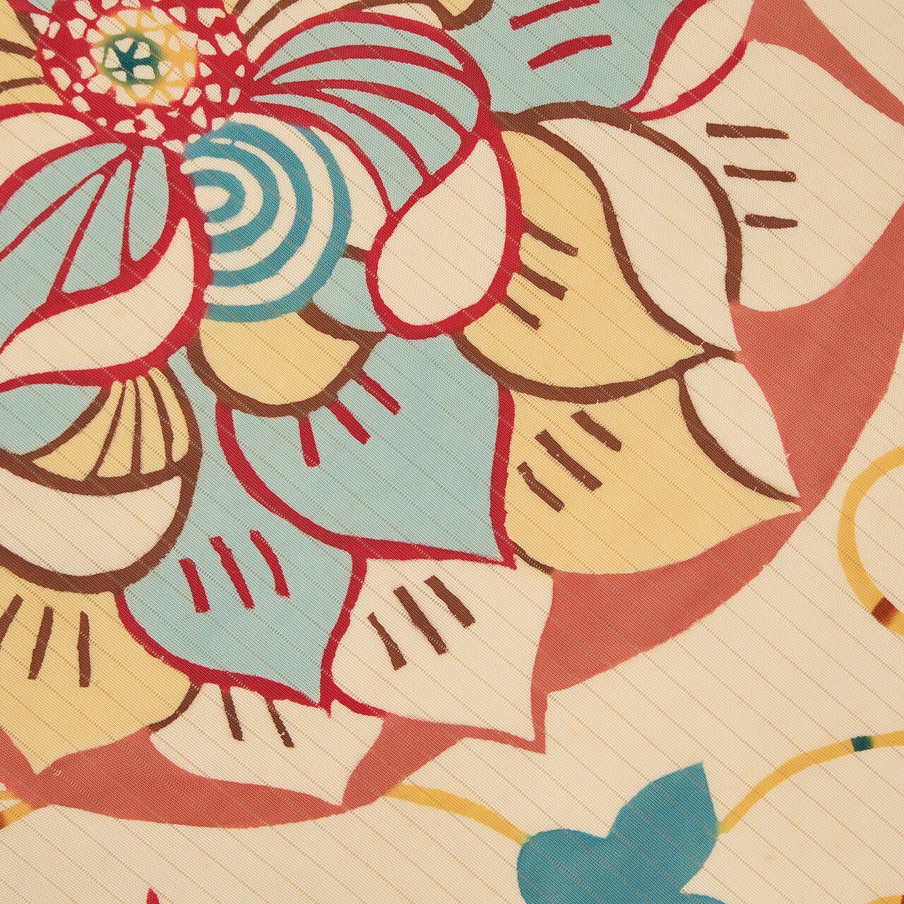 ダリアと思われるお花は躍動感が感じられ、また色とりどりに描かれ、特に浅葱色と蘇芳色とのコントラストがとても美しく、鮮明な色使いに目が覚めるような心地よさがあります。